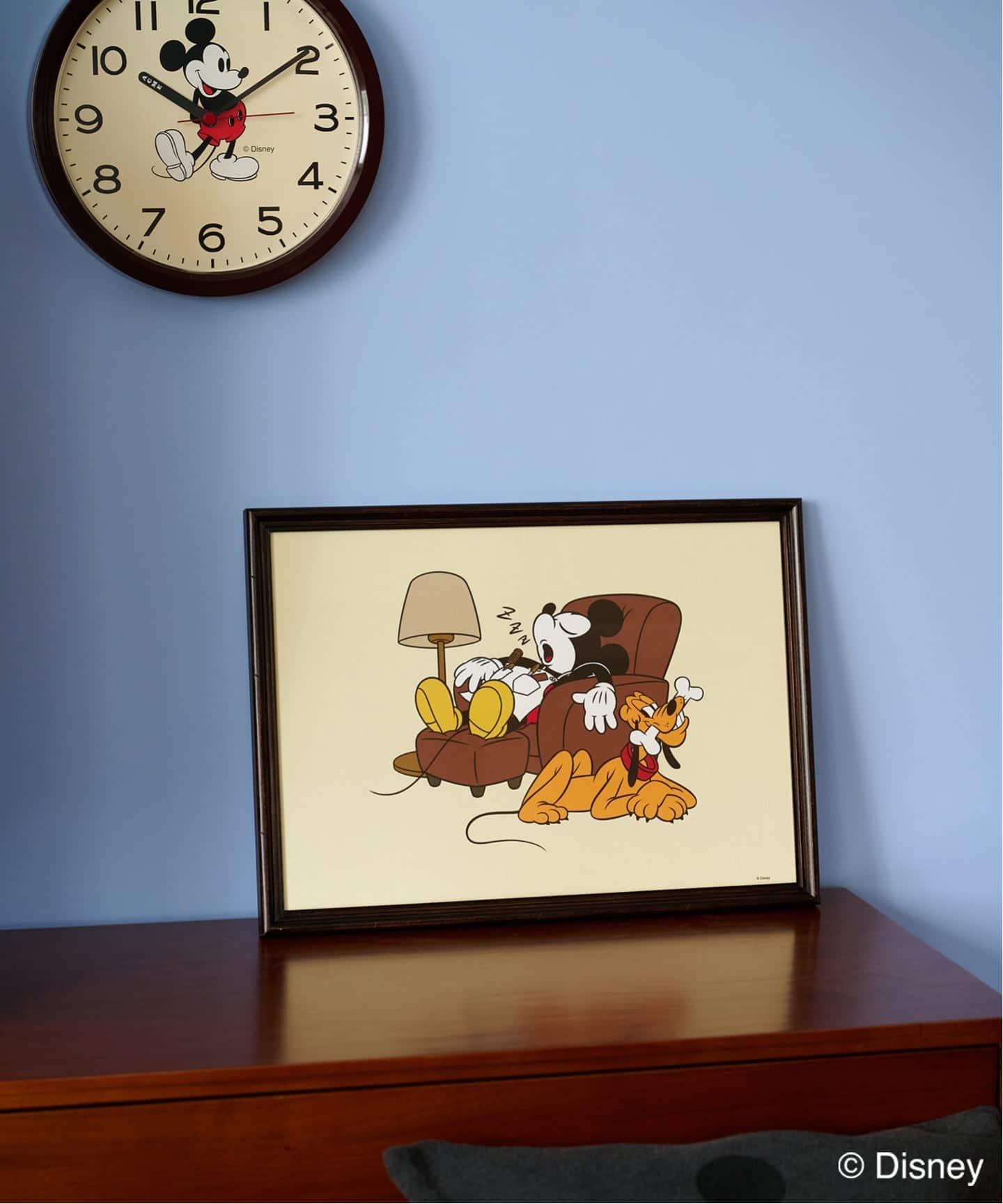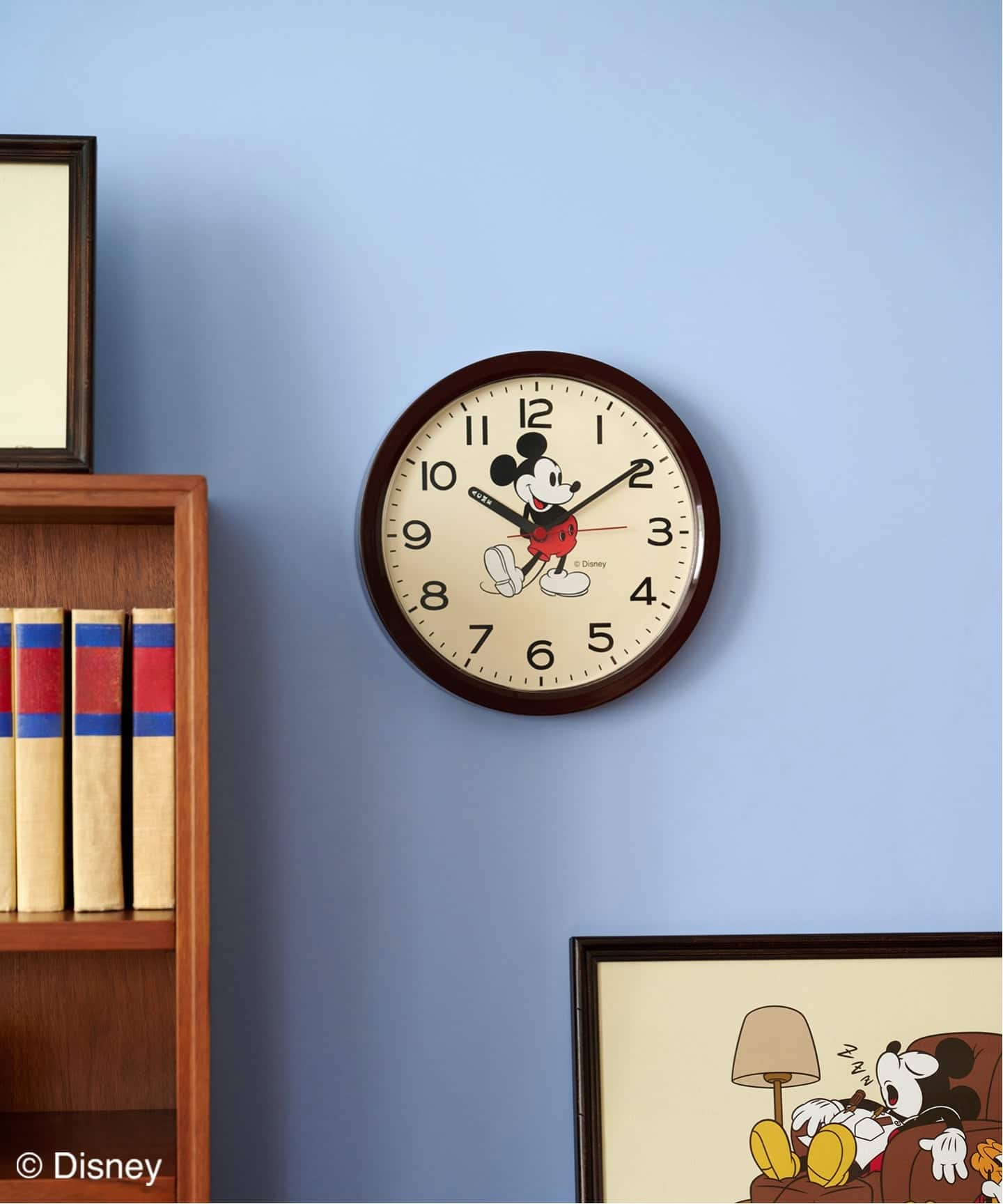 時計とパブミラーはスタンディングポーズのミッキーで、ヴィンテージのTシャツやスウェットでは希少な「白足」にし、色味をおさえてインテリアに取り入れやすく工夫しています。