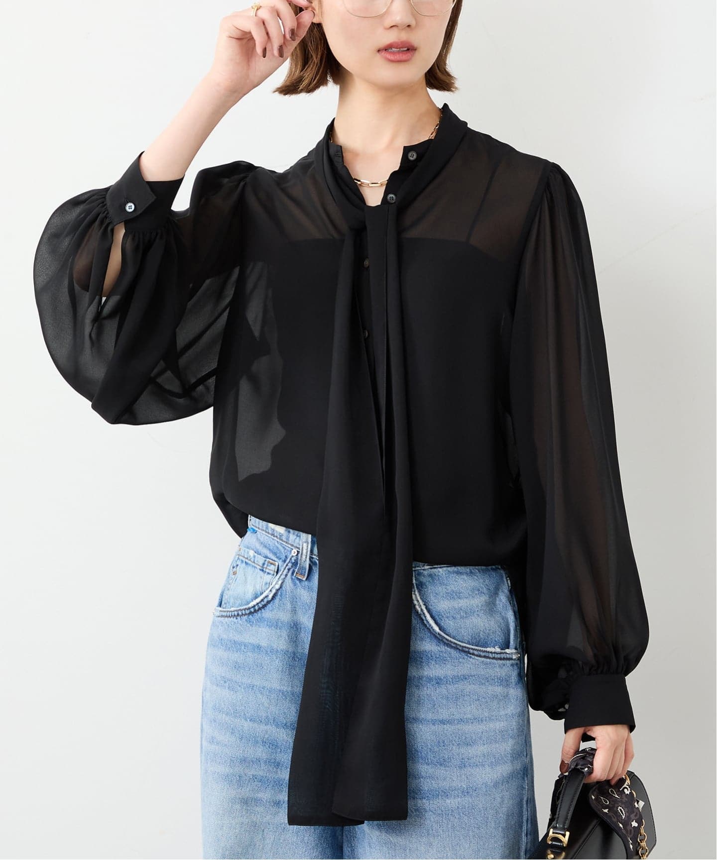 ボウタイブラウスは、マニッシュに垂らすだけでも様になる。