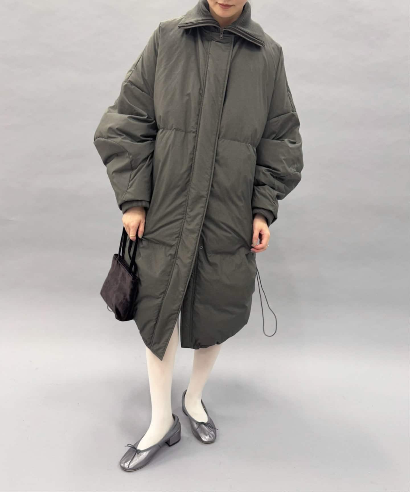 身頃から続いたスタンドの衿周りは、縦長のシルエットがあることでスッキリとした印象に。