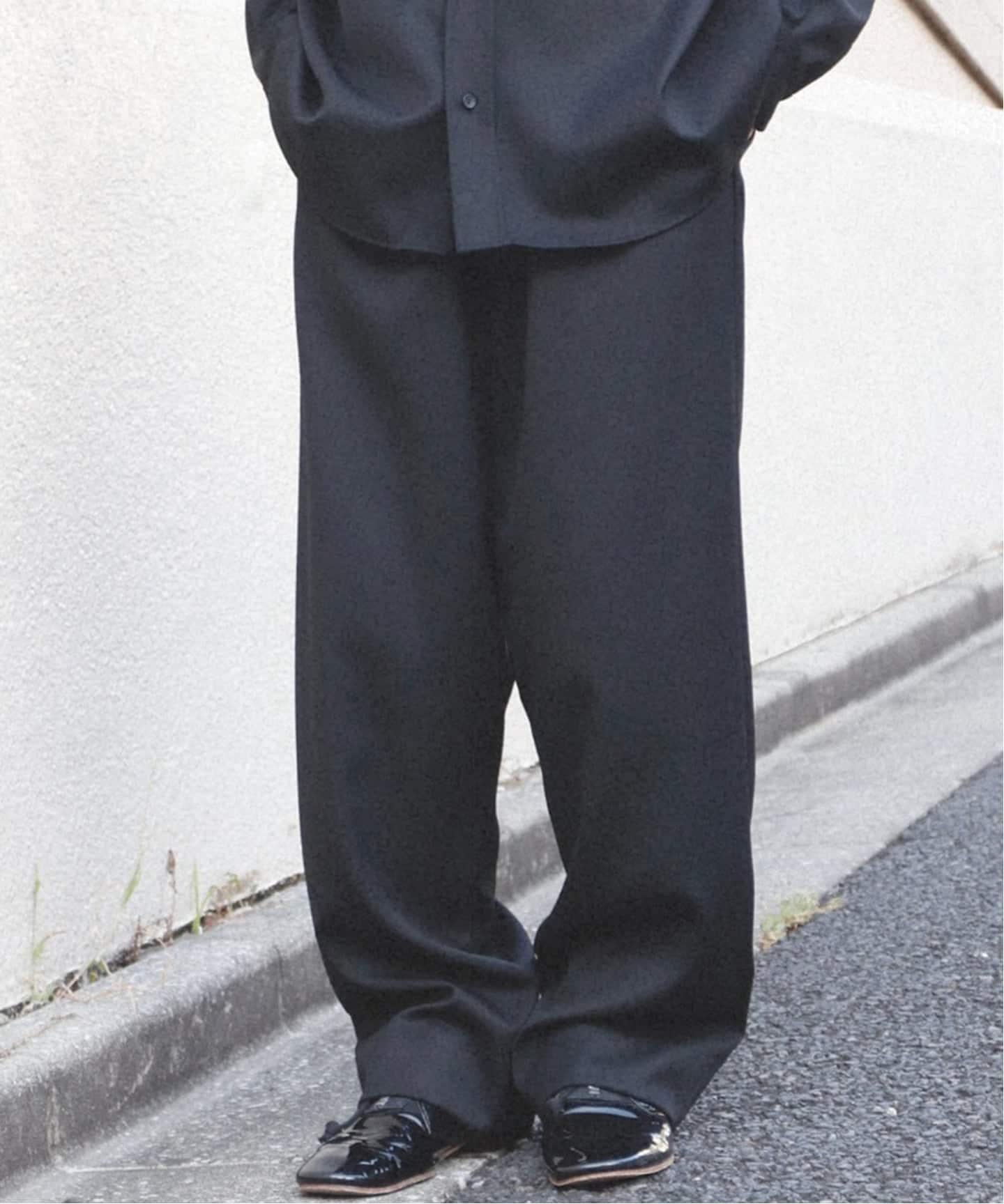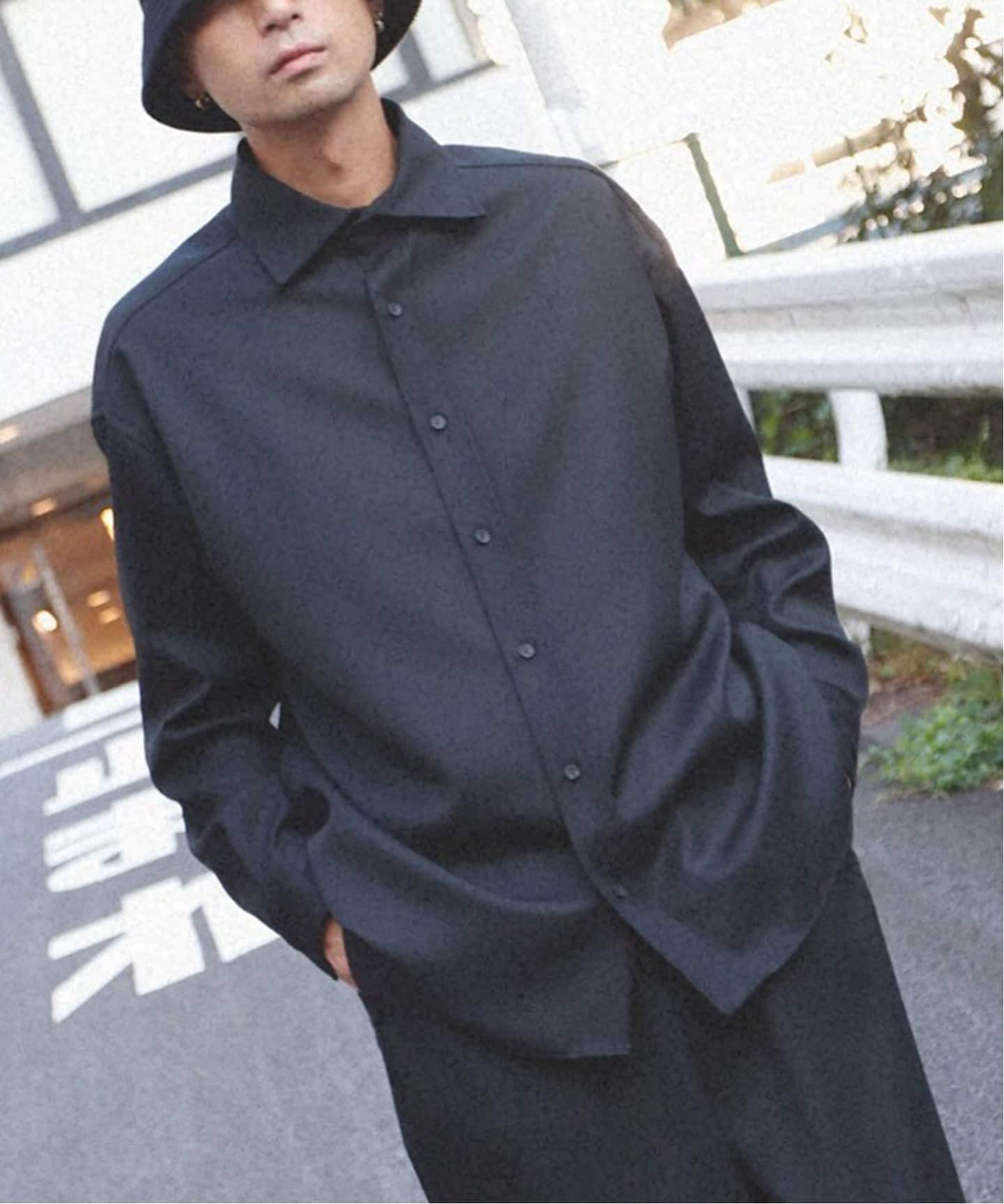 「主役は上品かつ上質なメリノウールのセットアップ。単調になりがちなオールブラックコーデを異素材合わせでメリハリを。ラグジュアリーストリートを素材で体現!」