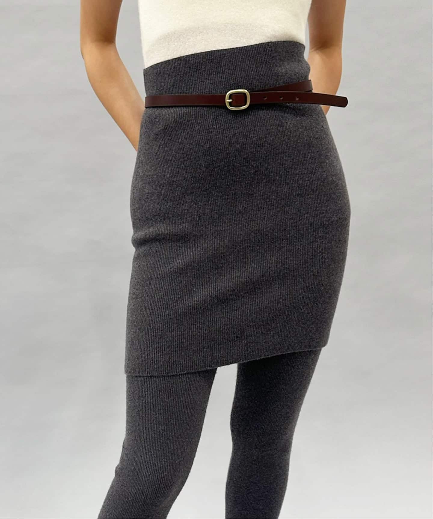 新作のミニスカート。レギンスと同様の総針で編み立てました。たての編み目が腰回りををすっきりとシャープにみせてくれます。