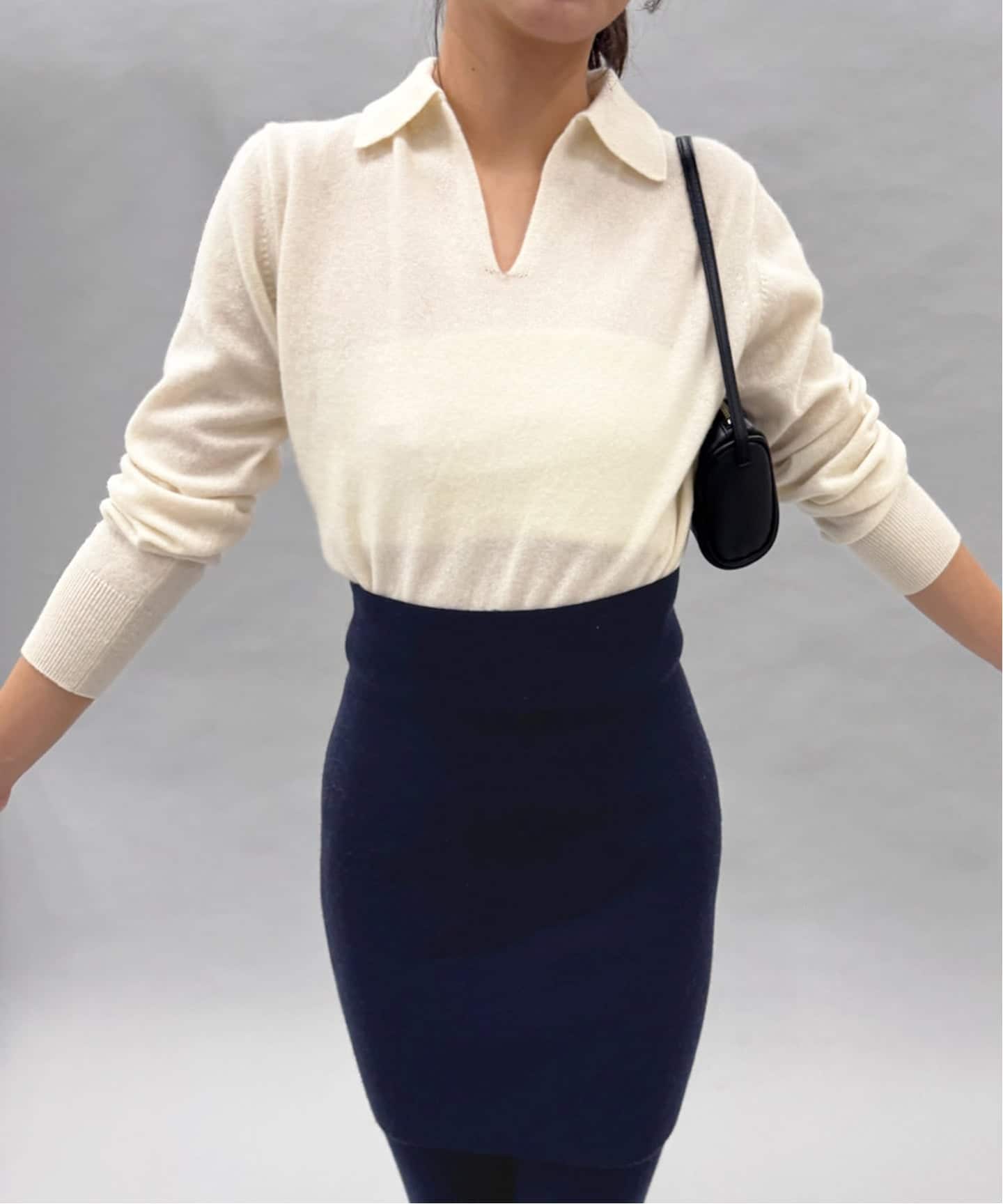 新作のスキッパートップです。昨年の衿付きよりもややラフな印象で着こなせます。