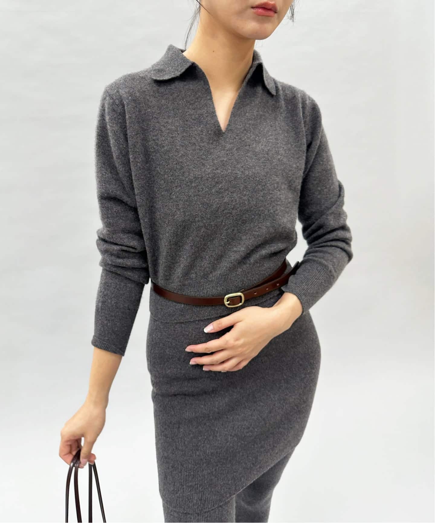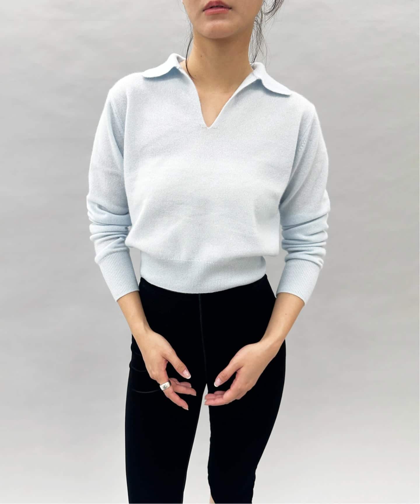 開きの部分を極力繊細に仕上げることでフェミニンに仕上げました。カーディガン同様、長めのリブがポイントです。