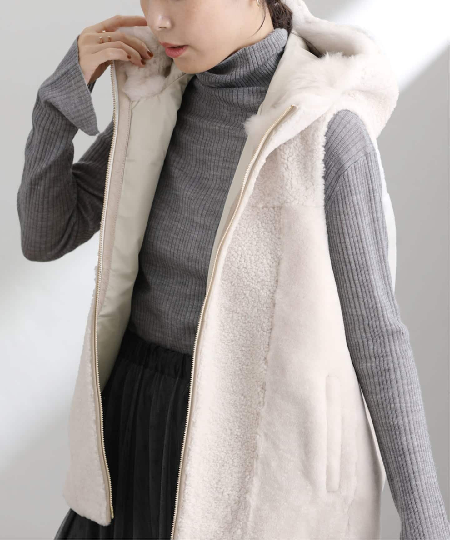 今シーズンバイヤーが惚れ込みセレクトした、上質なリアルムートンのコンビネーションを楽しむ大人のファーベスト。この特別感をデイリーに楽しむ贅沢。