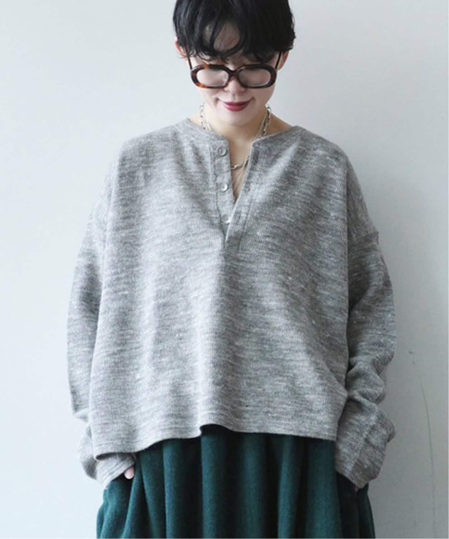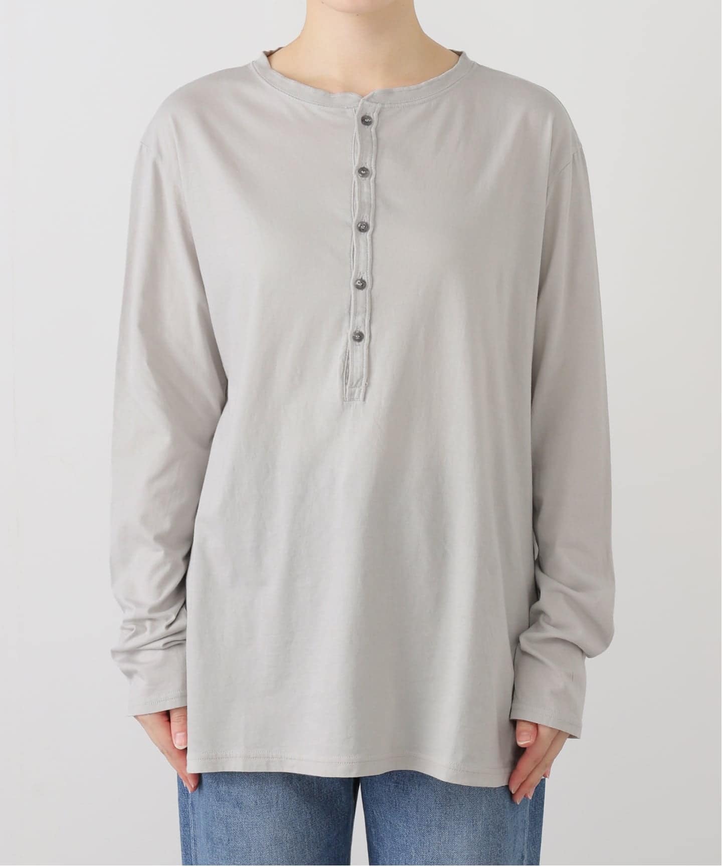 別注の生地を使用したヘンリーネックカットソー。製品染めで仕上げ、風合いよく仕上げています。一枚で着ても、インナーとしても、着やすいサイズ感にこだわりました。