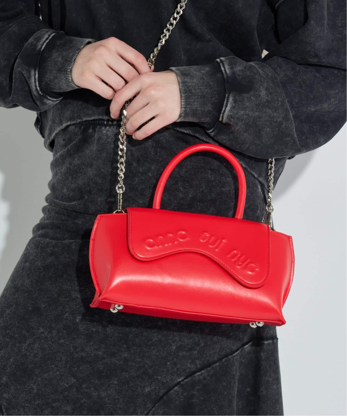 波打つようなラインのフラップと、ぷっくりと浮き立つブランドロゴが目を惹く、レトロさと未来感が融合したデザインで、スタイリングに新鮮なニュアンスを加えてくれるアイテム。