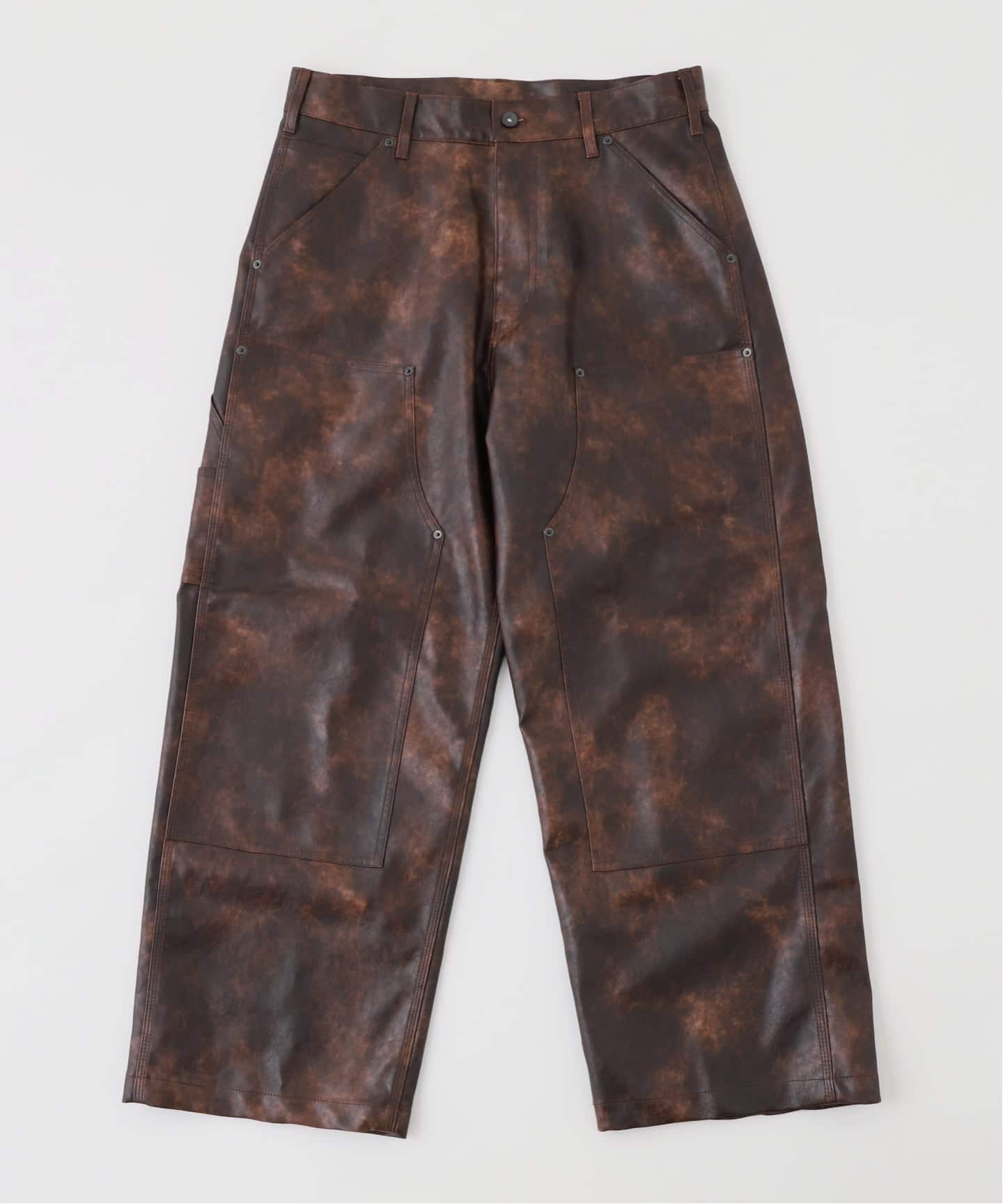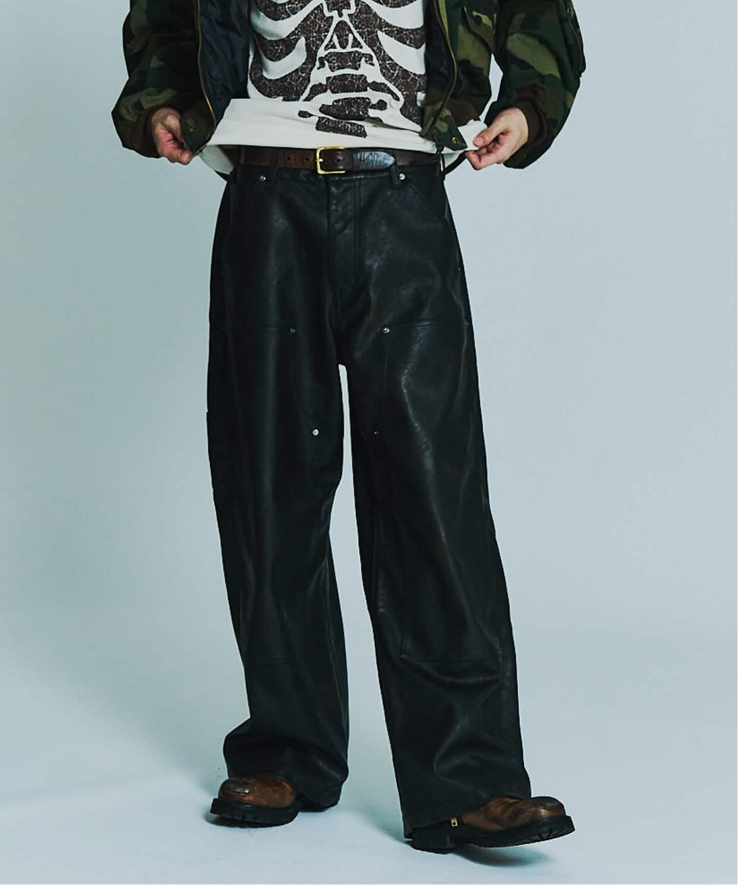 ダブルニー仕様で耐久性と無骨なディテールを兼ね備えたフェイクレザーパンツ。