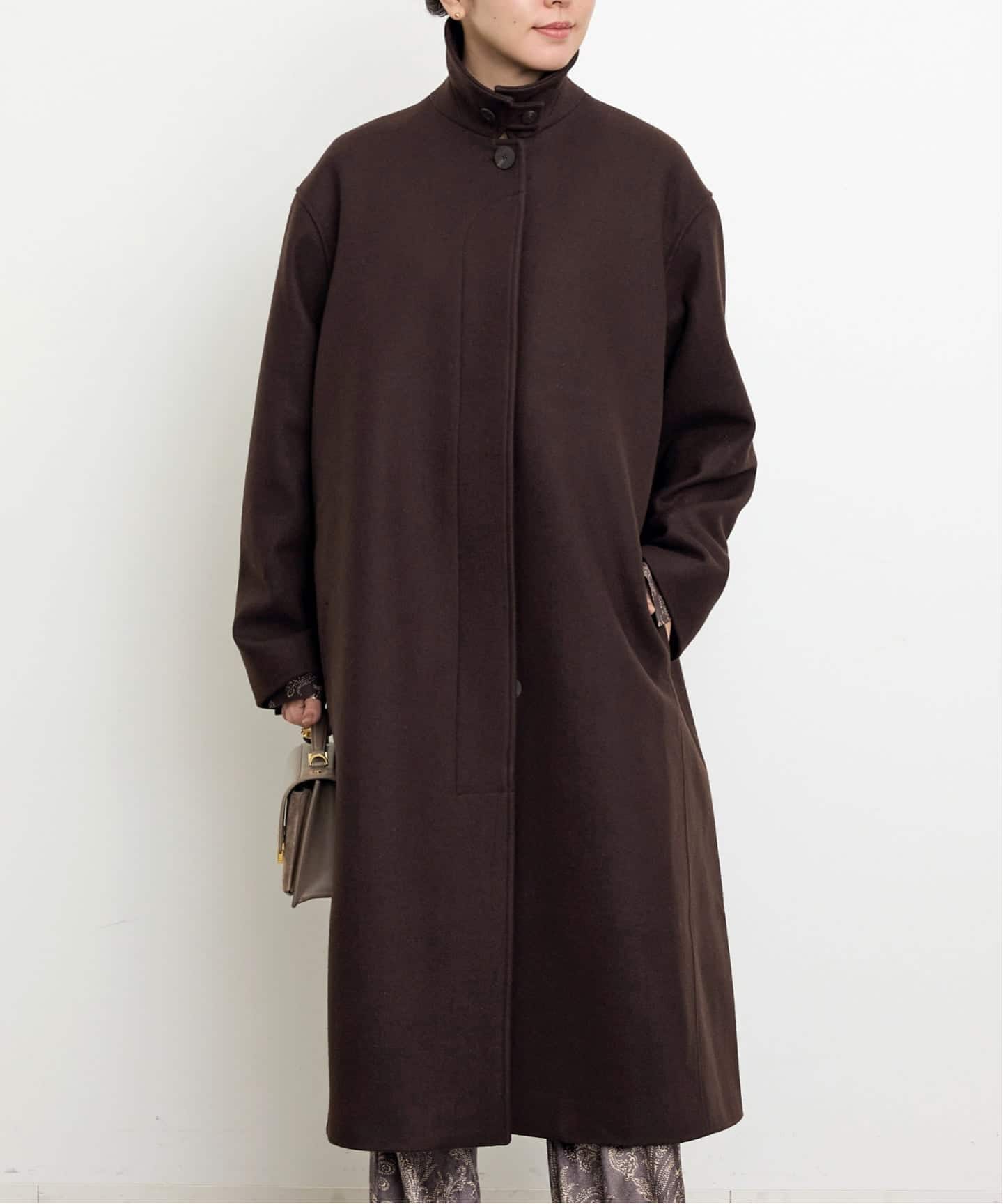 セットアップで玄人な着こなしには、STUDIO NICHOLSONのダークブラウンのコートに合わせてマスキュリンなエッセンスをプラス。上品なウールのメルトンを使用し、オーセンティックながらも女性らしく着こなせるタイムレスな一着。そぎ落としたデザインはオン、オフ兼用でデイリーに活躍します。