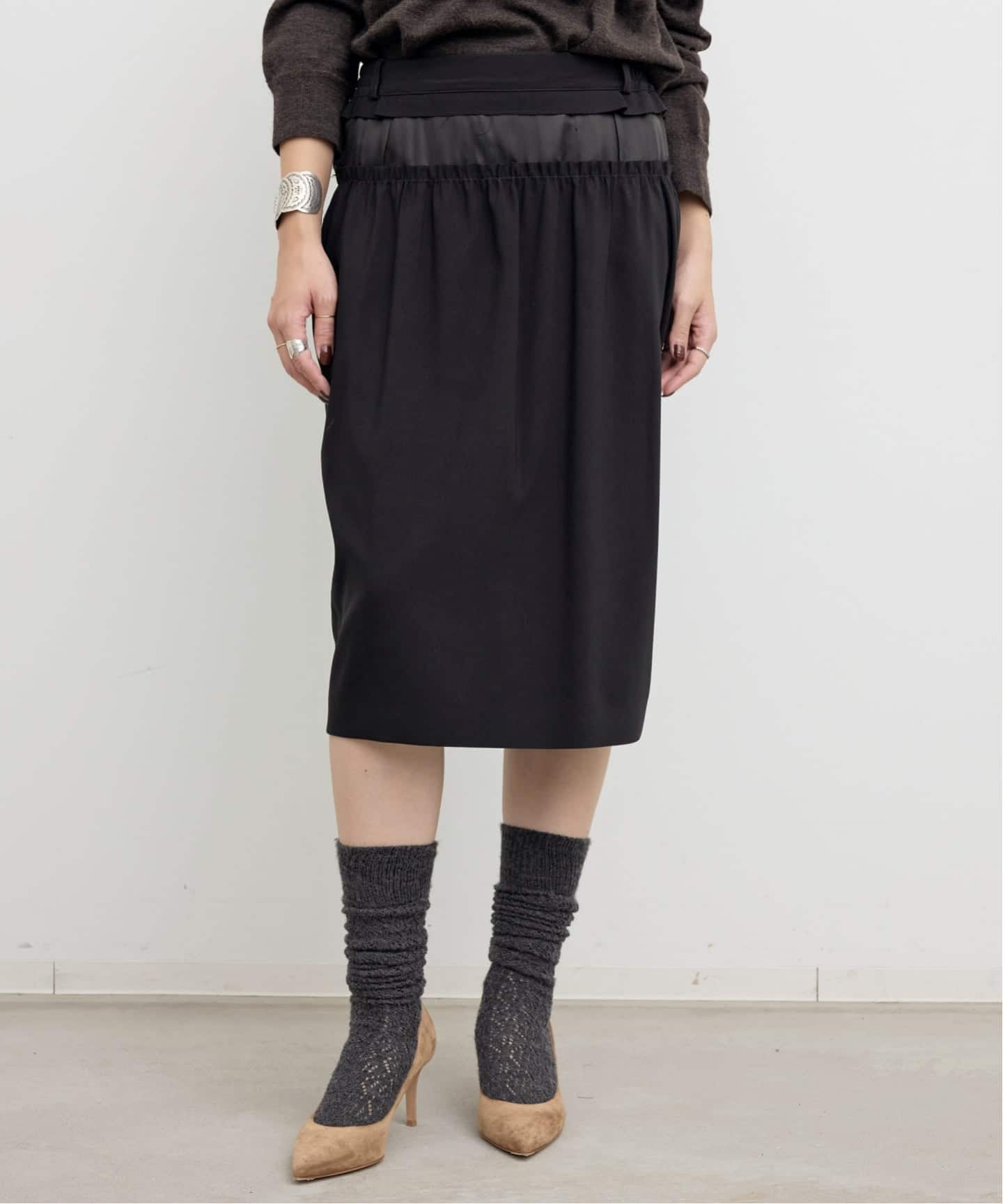 断ち切りのライニングがアクセントになるスカート。ワンサイズ展開でウエストはゴムの仕様なのでイージーなはき心地に加え、ジャストウエストやローライズなど、レングスを調整してはける優れもの。ボリュームのあるブーツやスニーカーなど、足元を選ばず幅広いスタイルに馴染んでくれるスカートです。