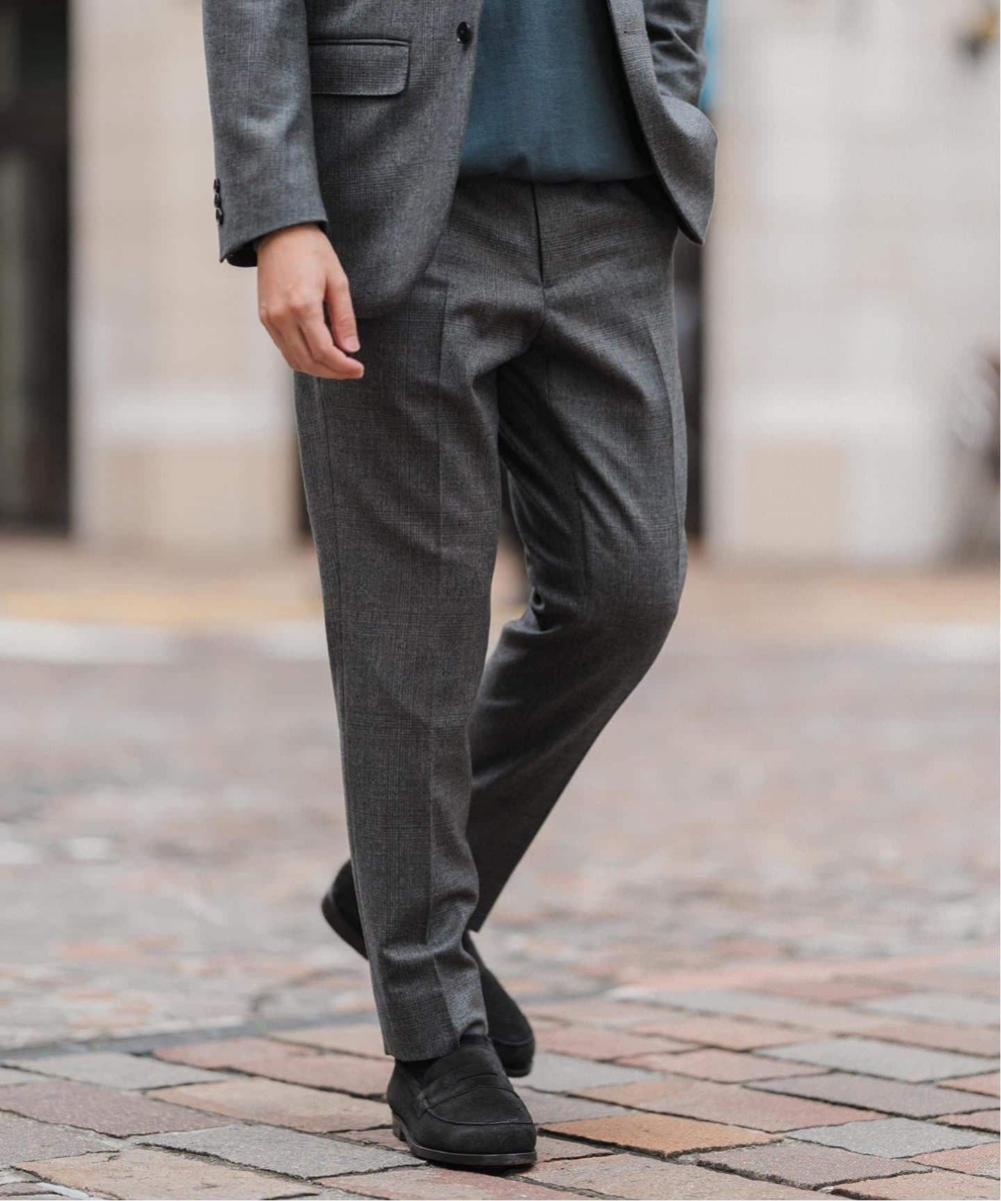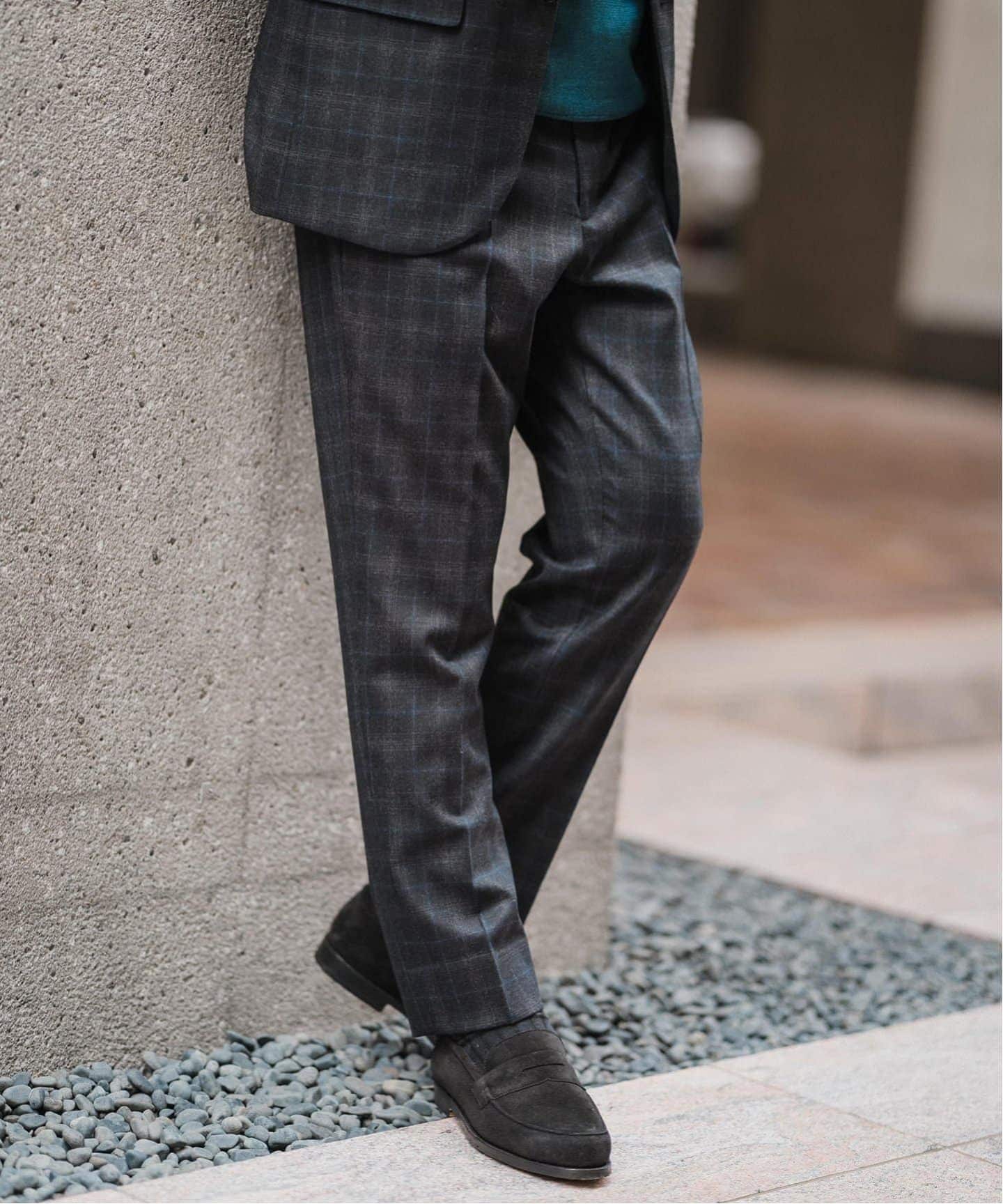 「ウールサキソニー」の一番の魅力は、組成や表面の質感、柄の構成に至るまでこのアイテムのために、1から作り上げたオリジナルのファブリック。高級感あふれる毛並みと、滑らかな肌触りが特徴で、スッキリとしたラインの美しいシルエットバランスと共に、ドレッシーな着こなしからカジュアル使いまでを網羅した、まさに全方位型のセットアップに仕上がりました。