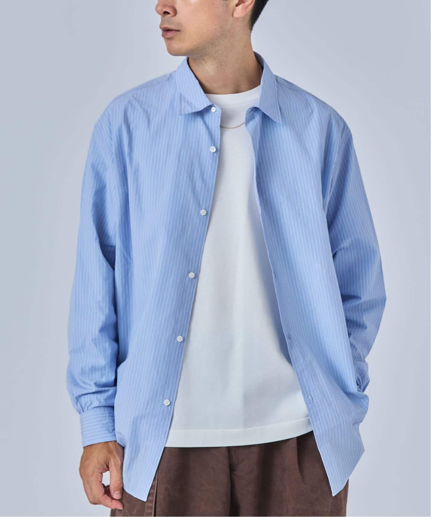 シャツ型ながら、ドレス感のある貝ボタンをあしらい、アウターとしても映えるデザイン。襟元は美しく整い、すっきりとした印象を演出します。