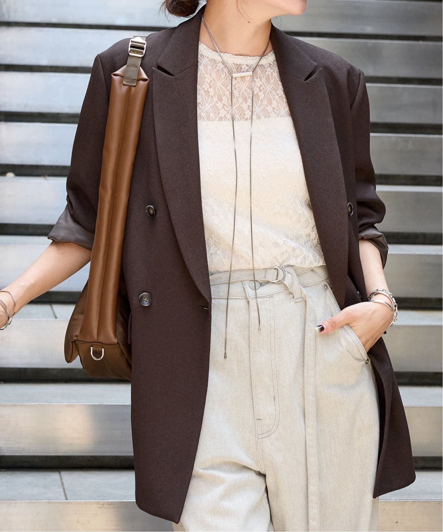 ダブル仕様でピークドラペルのマスキュリンなデザイン、素材の柔らかさと絶妙なサイズ感で、かっこよくも女性らしくも着こなせます。