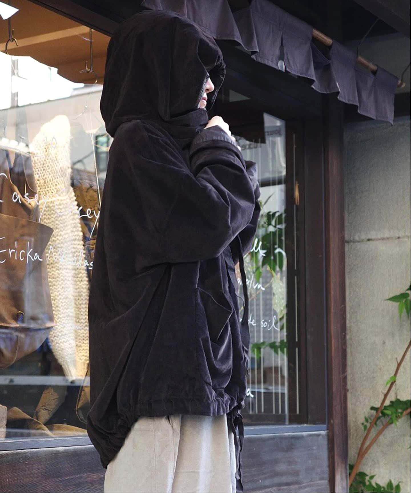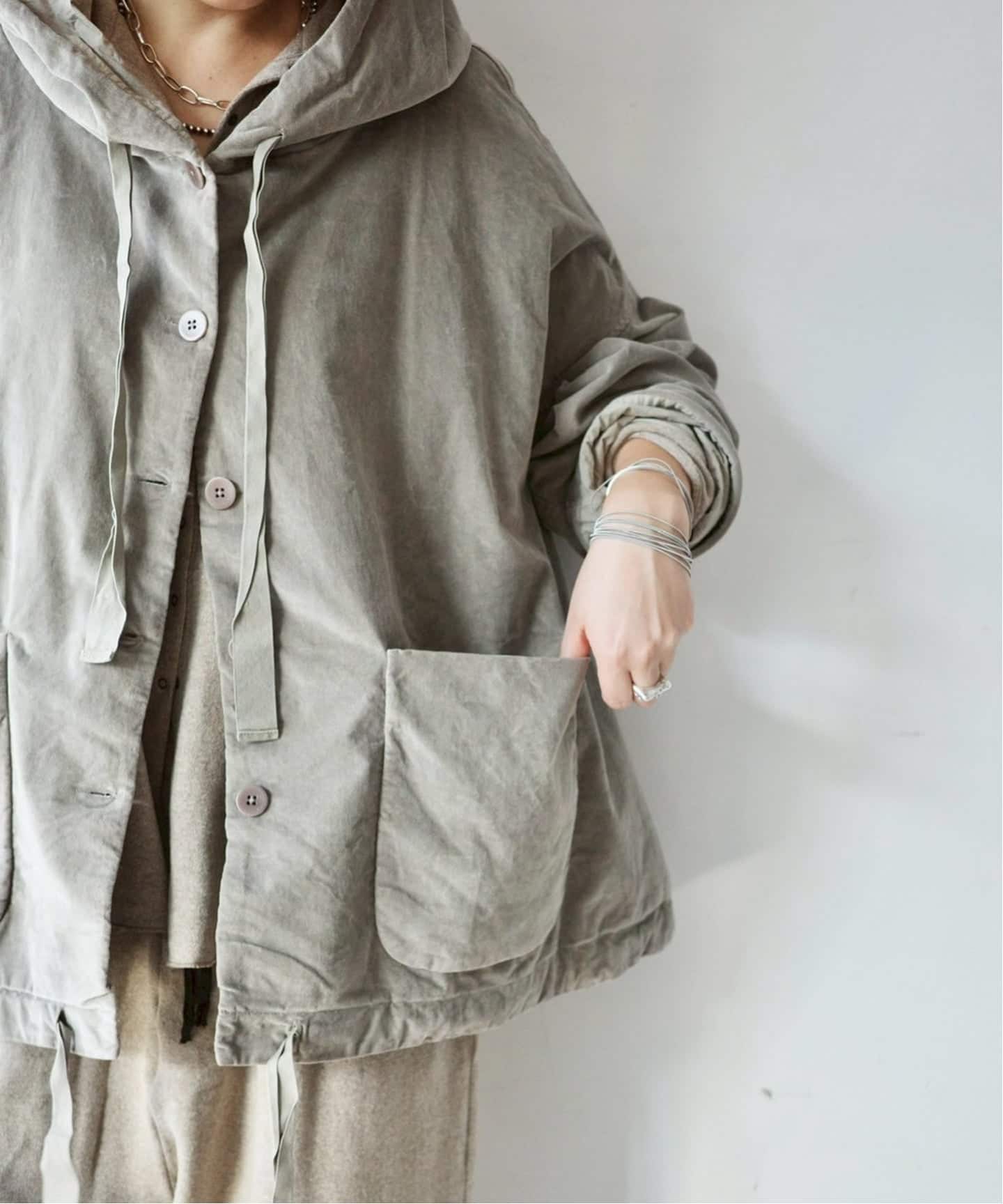 ニューモデルの、VELVET素材のフードジャケット。裾のコードを絞って、シルエットに変化を付けられます。フロントの大きなポケットもポイントです。