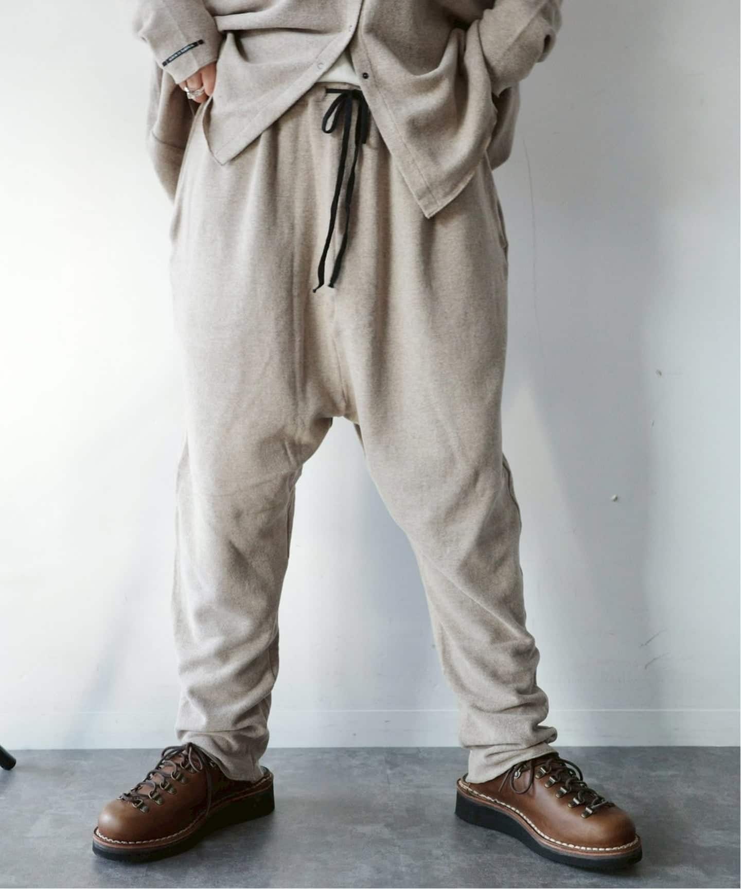 JERSEY素材の定番イージーパンツ。サルエルパンツのような深い股下がポイントです。(ベージュ:身長165cm XL着用、ブラック:身長162cm Mサイズ着用)