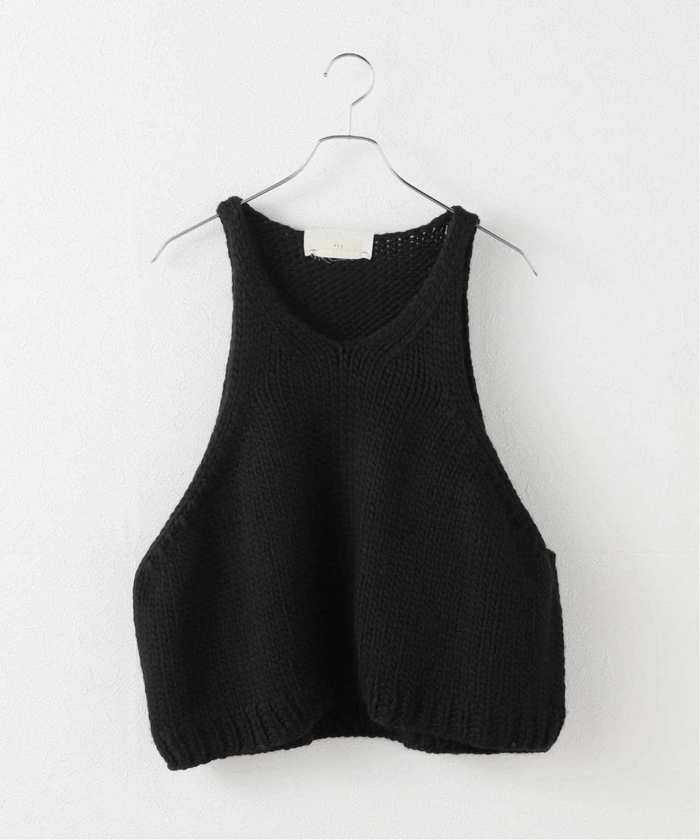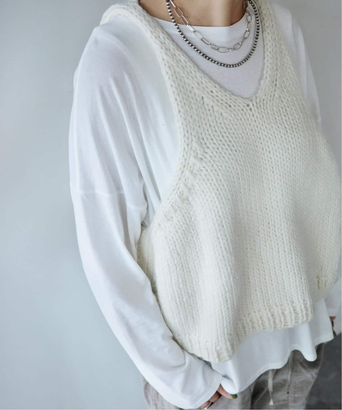 ハンドニットコレクションのベスト。脇ぐりが開くので、レイヤードしやすくなっています。首の後ろのタグもポイントです。