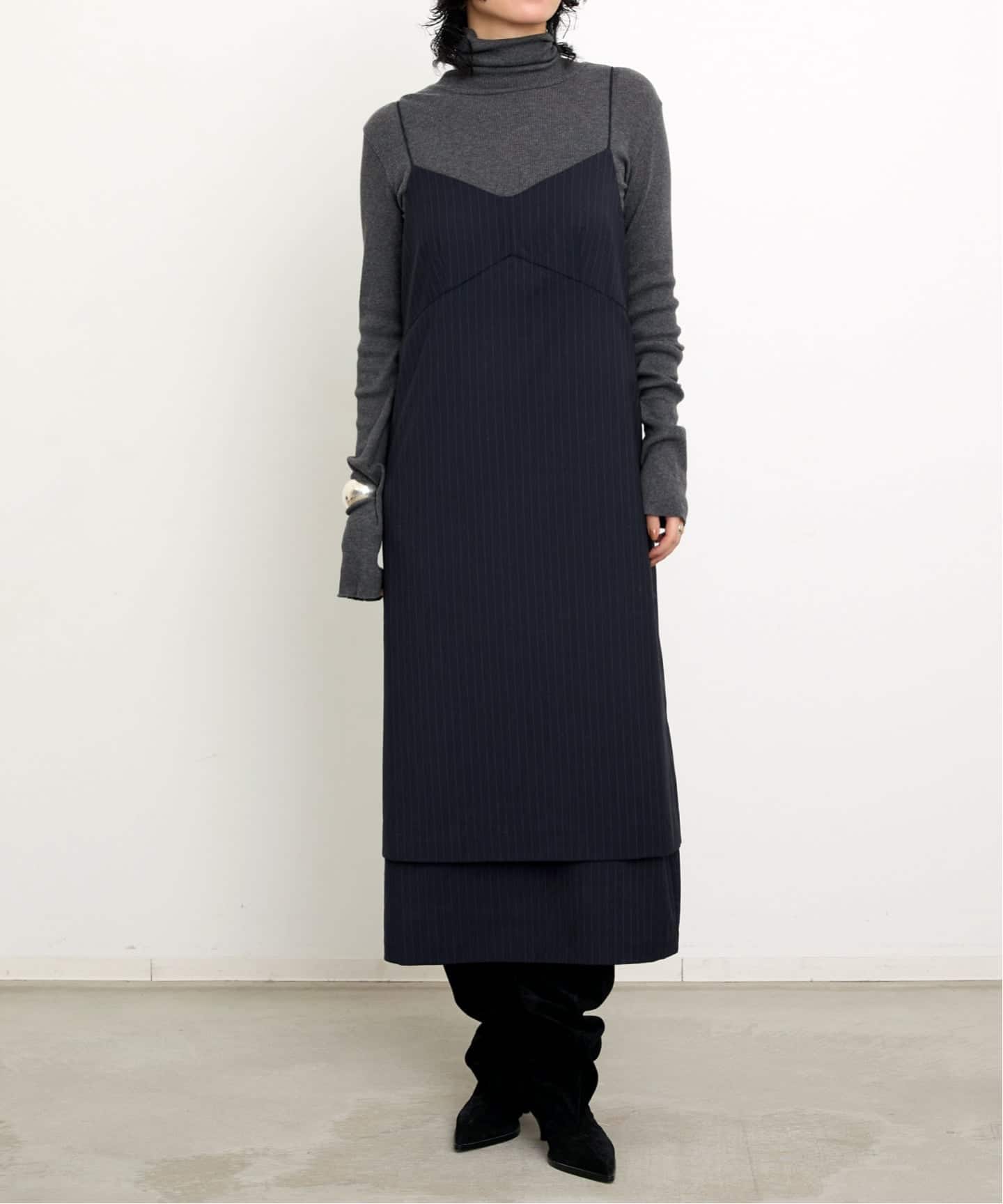 華奢な肩紐とVネックの胸元がレディライクなワンピース。ハンサムなストライプ生地とのバランスが絶妙です。