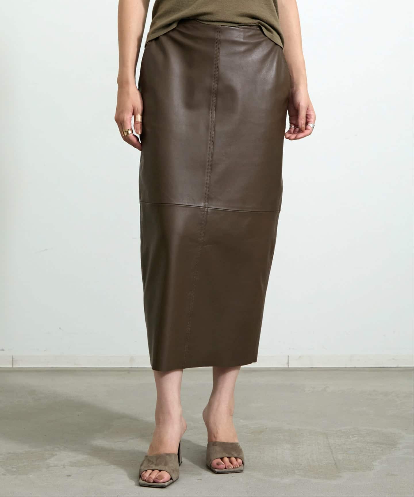 カーキの色味が目を引くレザー素材のタイトスカート。