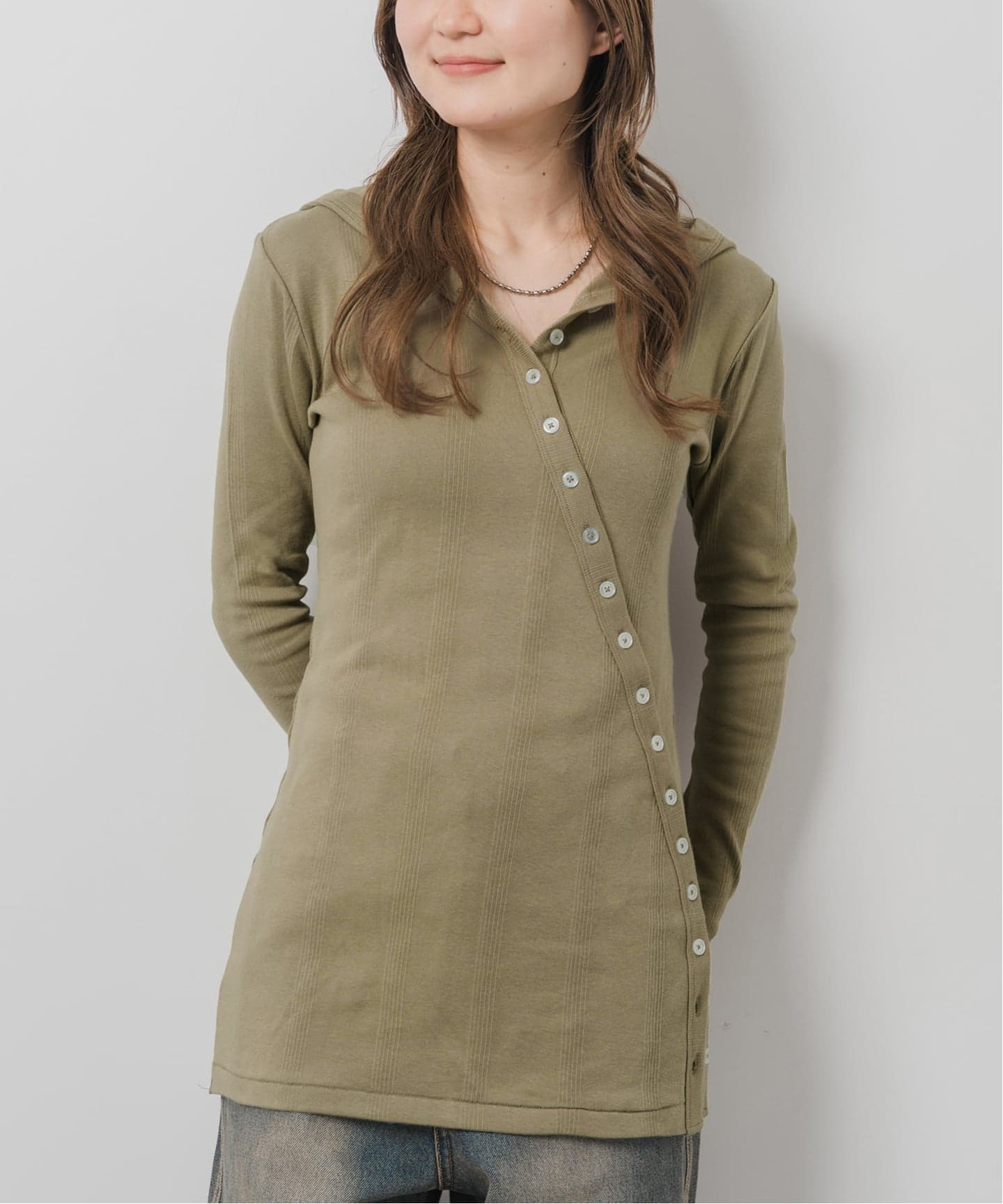 ボタンを少し開けると、スリットのような抜け感が生まれ、こなれた印象に仕上がります。