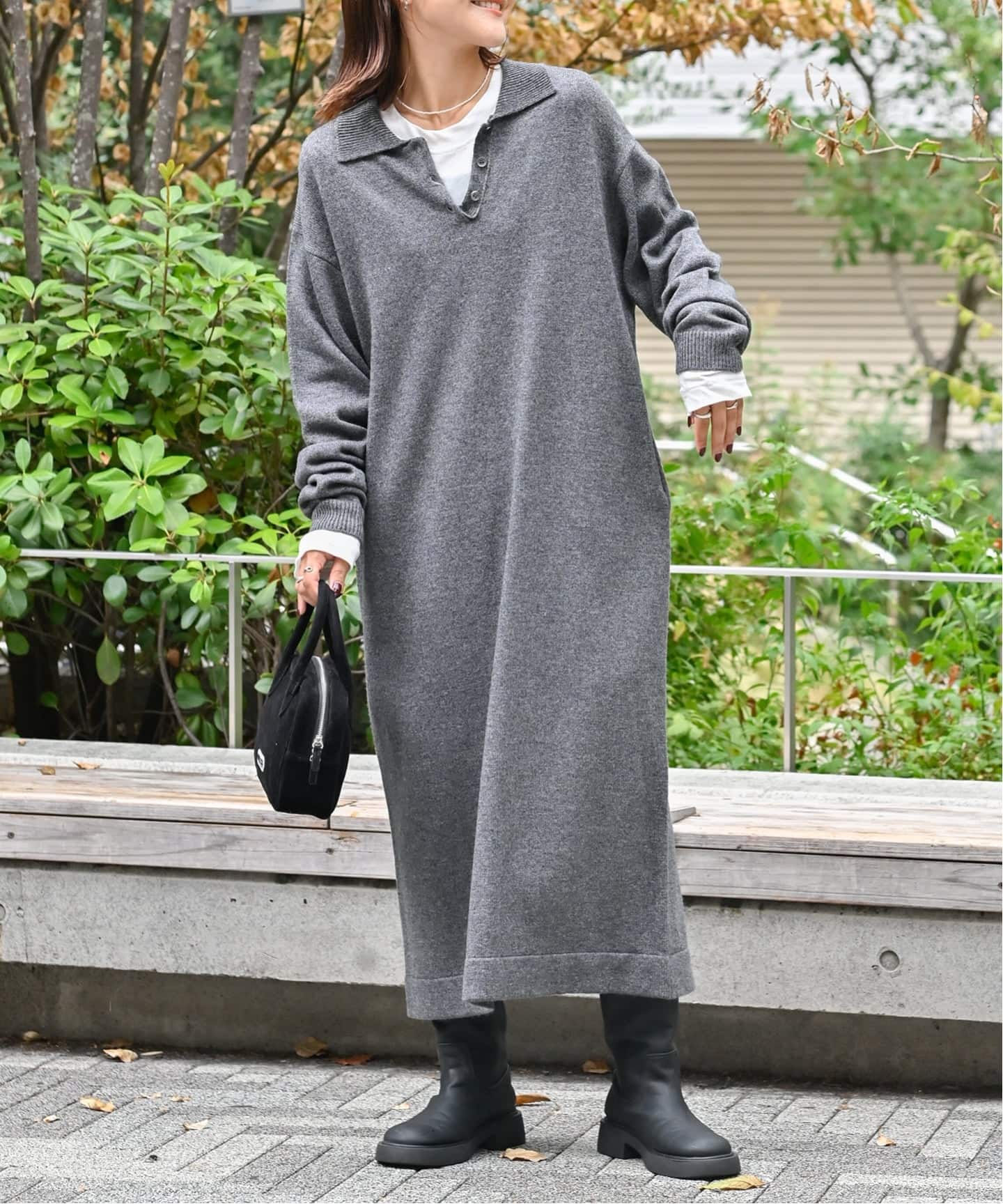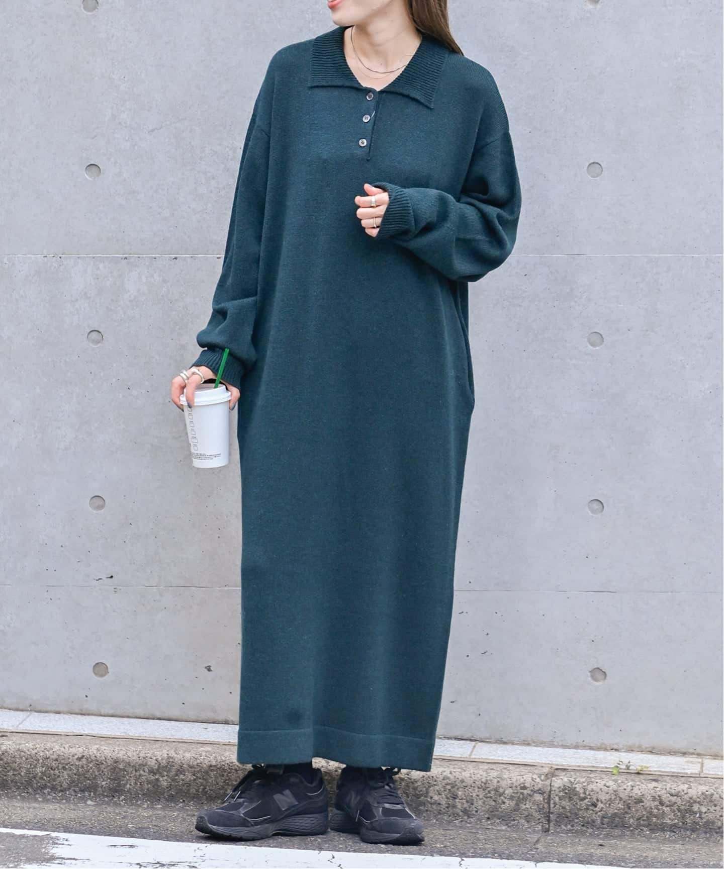 ウールミックスのミドルゲージ天竺でトップのグレーとダークなフォレストグリーンの2色展開。軽くて暖かくロング丈ですが、ダレにくくカジュアル過ぎない上品な質感で主張し過ぎない好評のポロ型のニットロングワンピースになります。両脇にスラッシュポケットも嬉しい仕様。ソックスとローファー等、プレッピーなスタイリングがお勧め◎