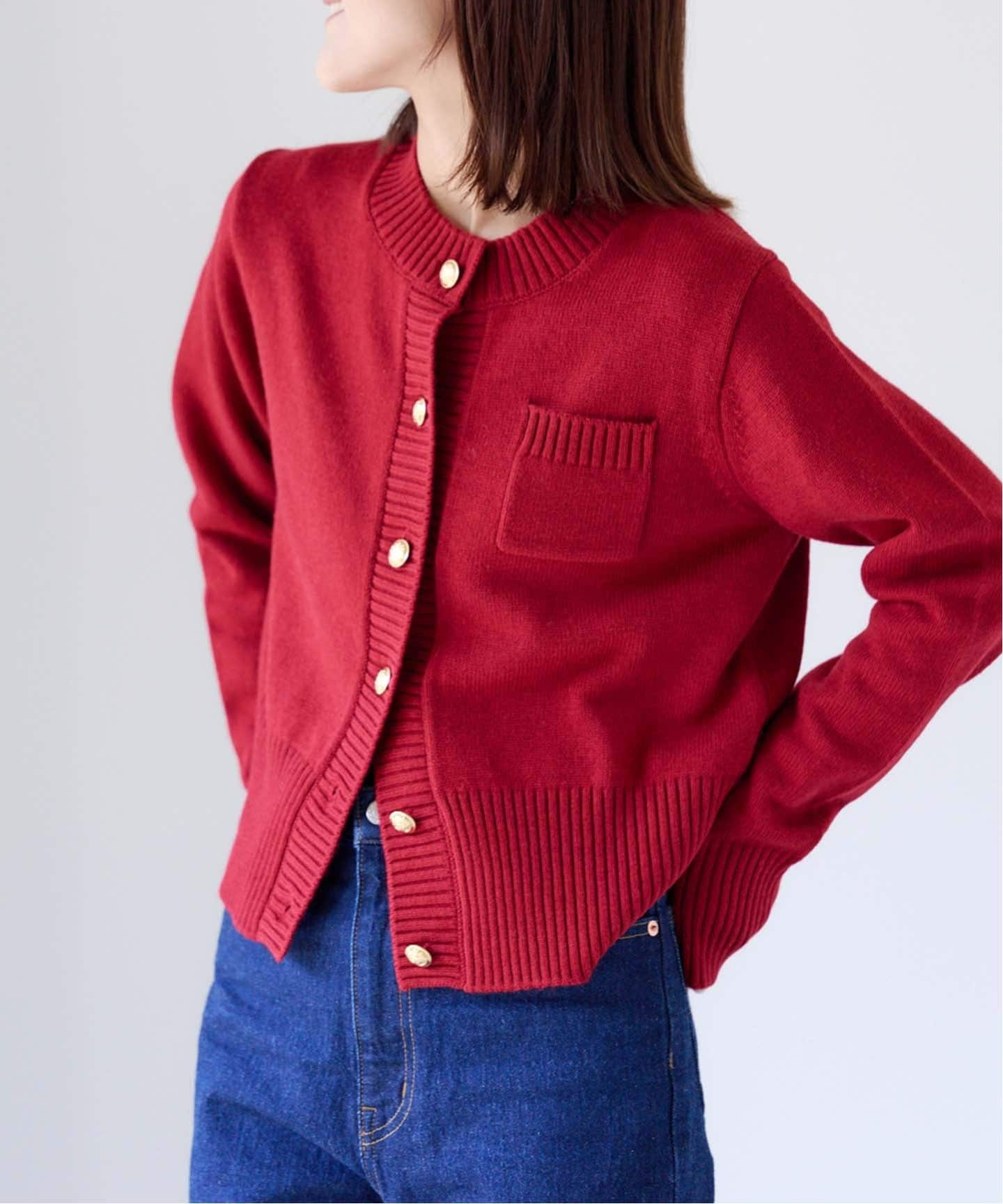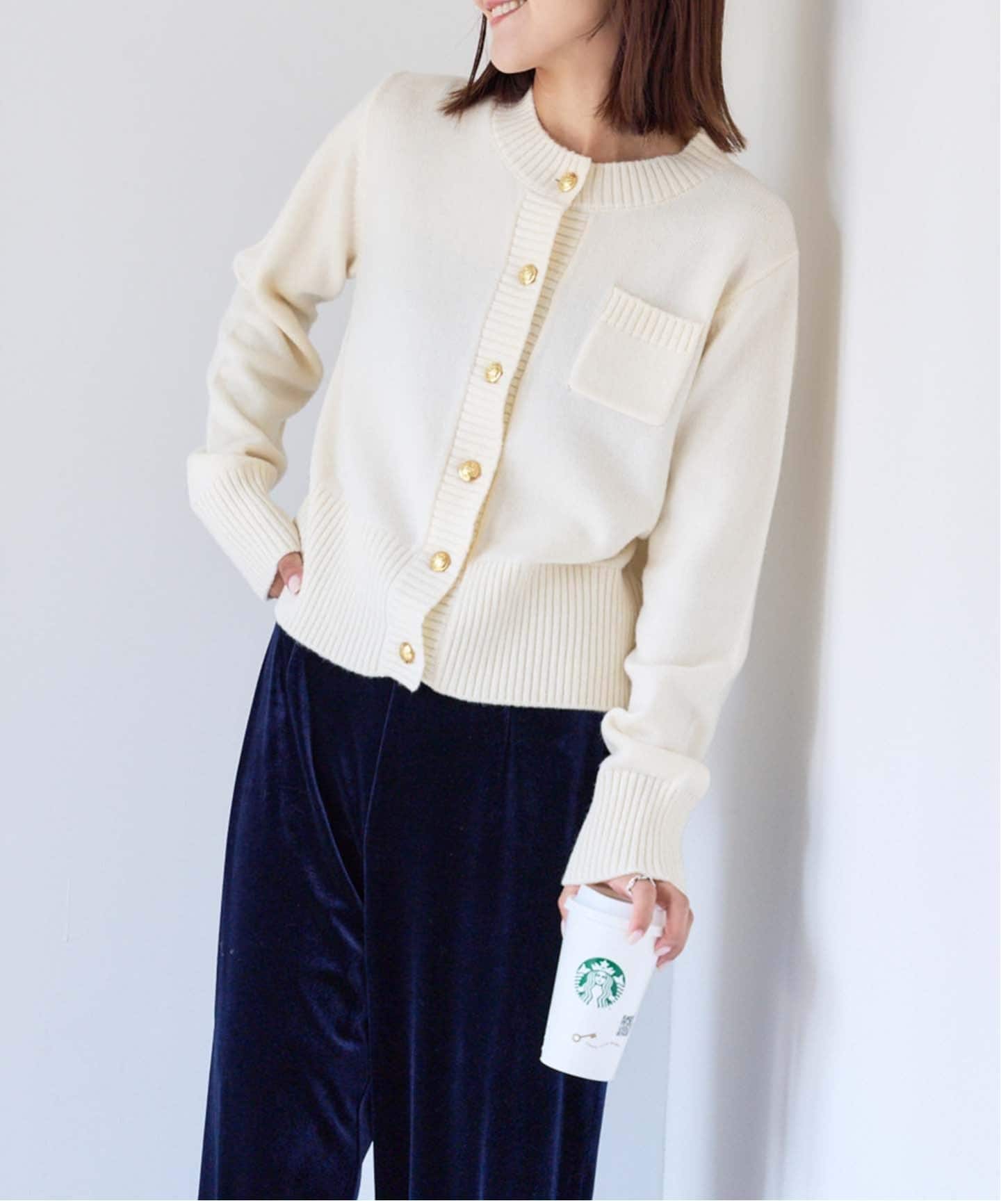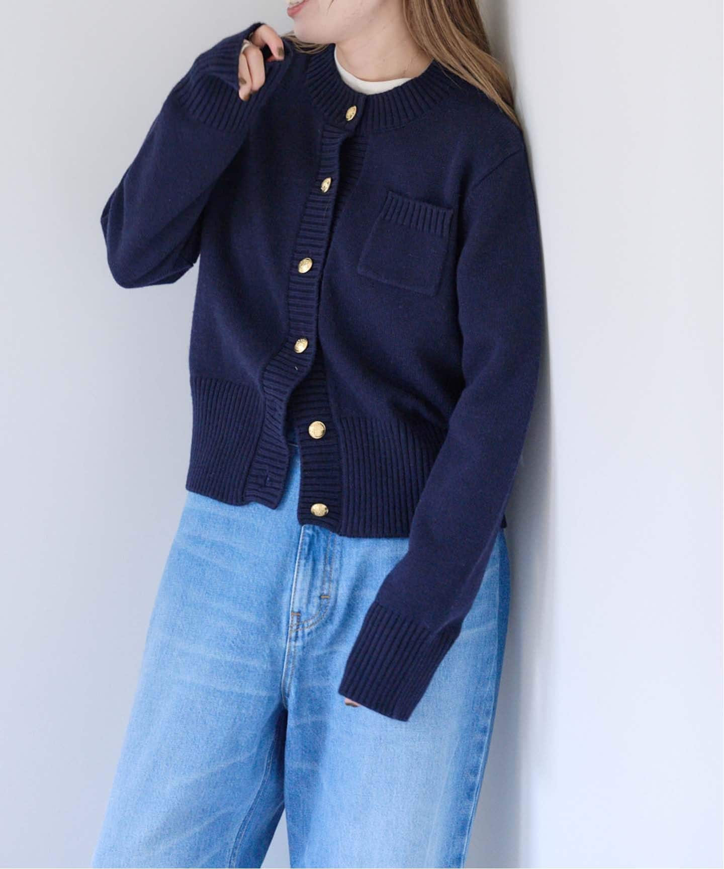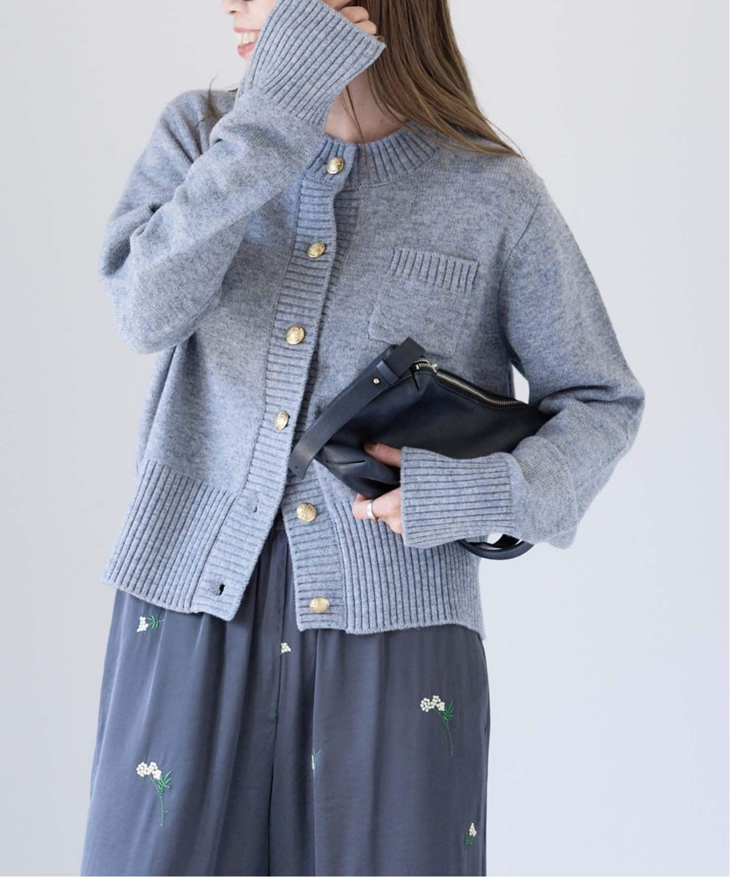 ウール混の紡毛糸をミドルゲージで程よい厚み感のニット素材。エンブレム柄入りのゴールドボタンが華やかなニットカーディガン。デニムやカジュアルボトムはもちろんスカート合わせもしやすい羽織アイテム。
