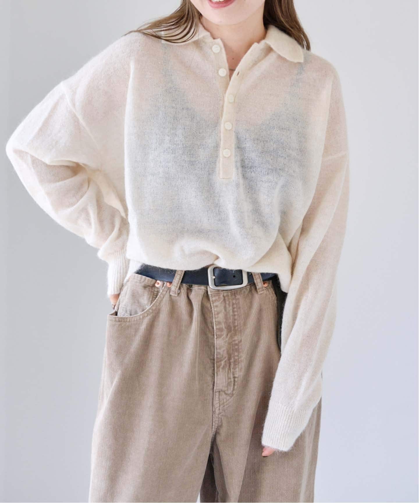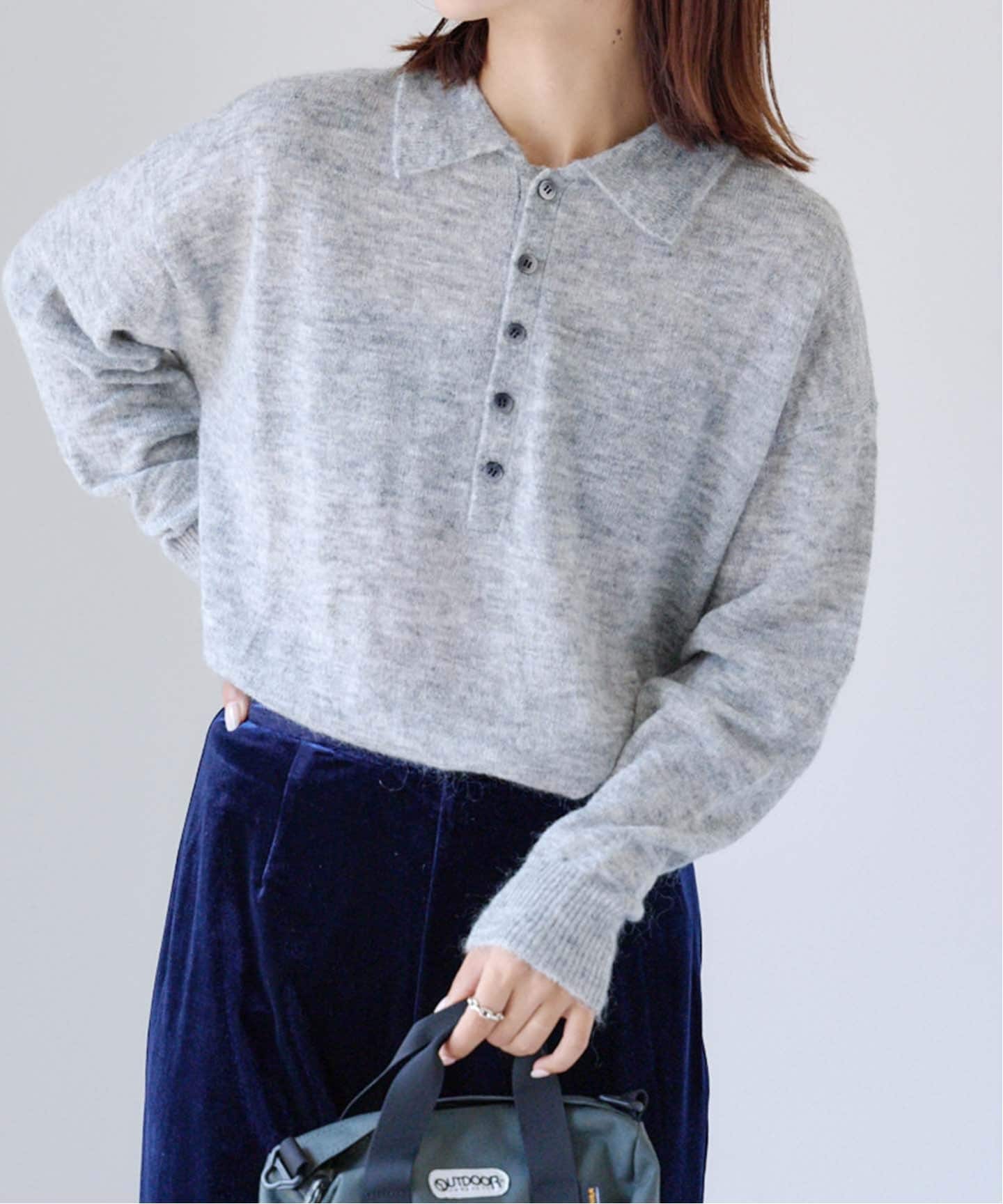 ふわっと柔らかく暖かみのあるモヘヤをブレンドした糸。ミドルゲージのプレーンな天竺編みで甘めにふわっと軽く編み上げた素材を使用しています。メンズライクなポロシャツ衿のプルオーバーをふわっとした柔らかい甘めの素材とゆとりあるルーズなサイジングで仕上げました。カジュアルボトムはもちろん、キレイ目なボトムにも合わせやすいマルチなアイテム。