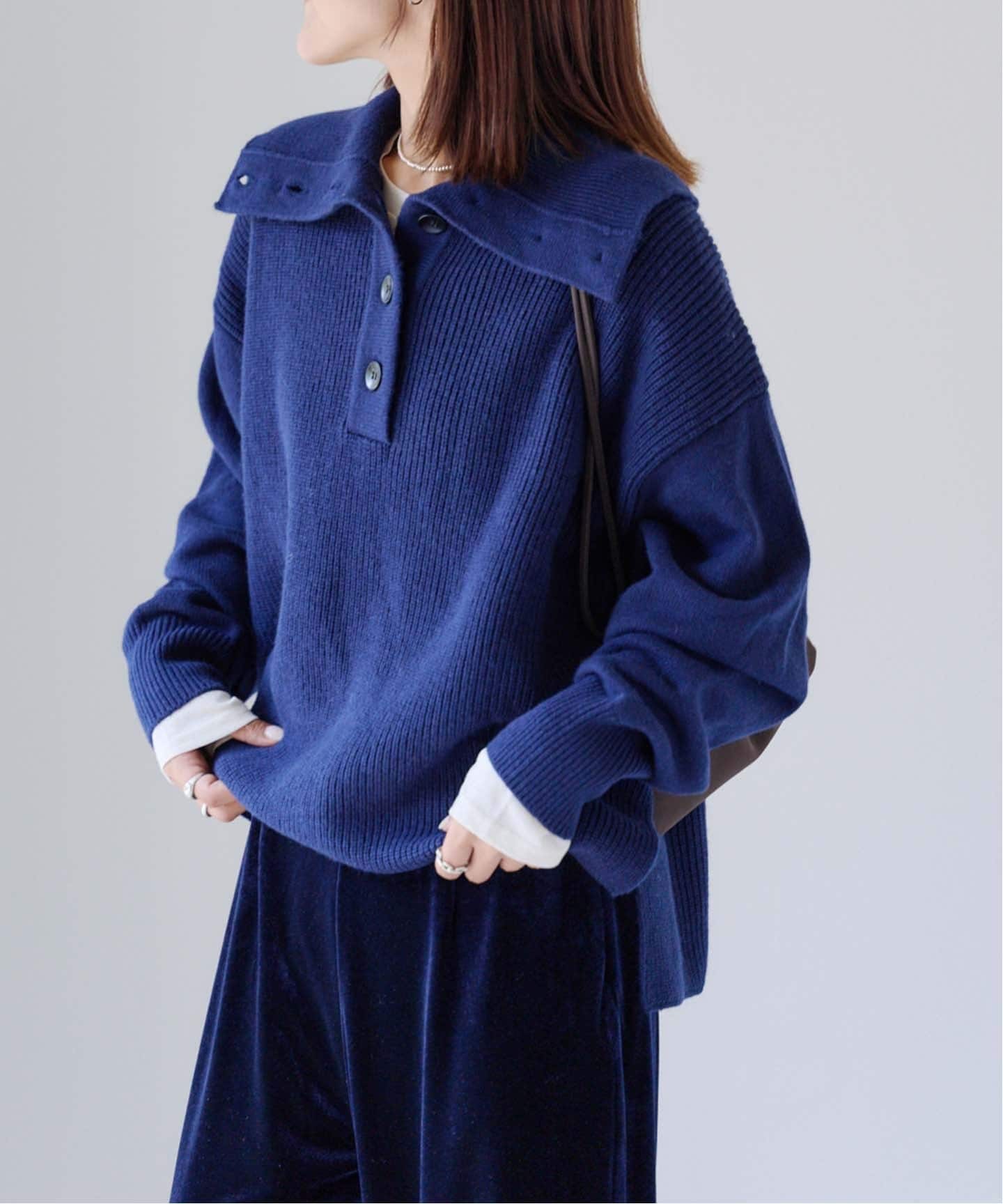 ウール混の紡毛糸をざっくりと畦編みした身頃とプレーンな天竺編みの袖との編地変化と大きな衿が印象的なニットプルオーバー。上まで釦を止めればルーズなタートルネックにも、身体のラインを拾わない程よく大きいサイジングと裾脇スリット開き、前後着丈差あるステップヘム、さっと一枚着るだけでサマになるニットプルオーバーアイテム。