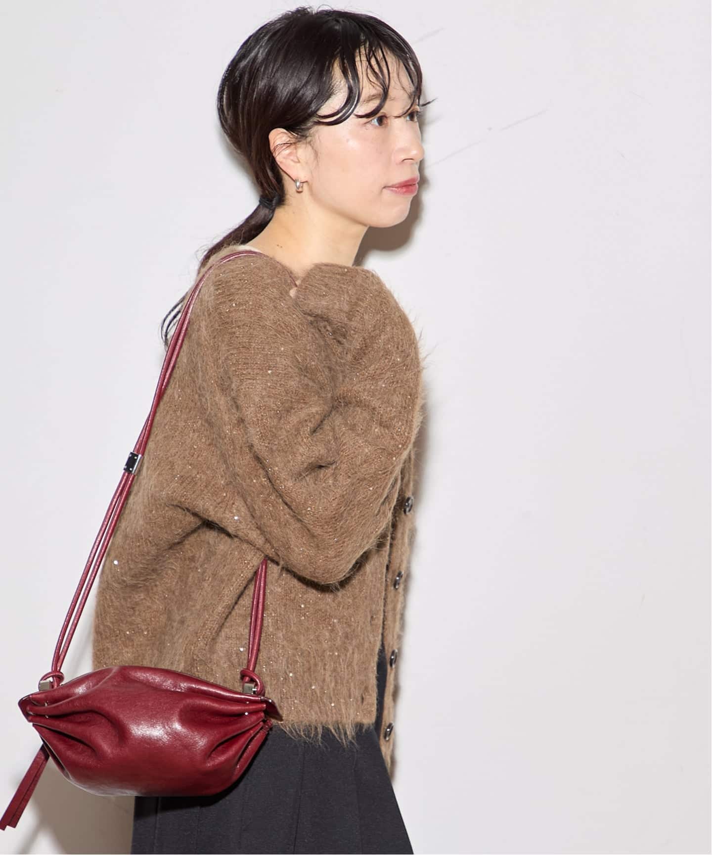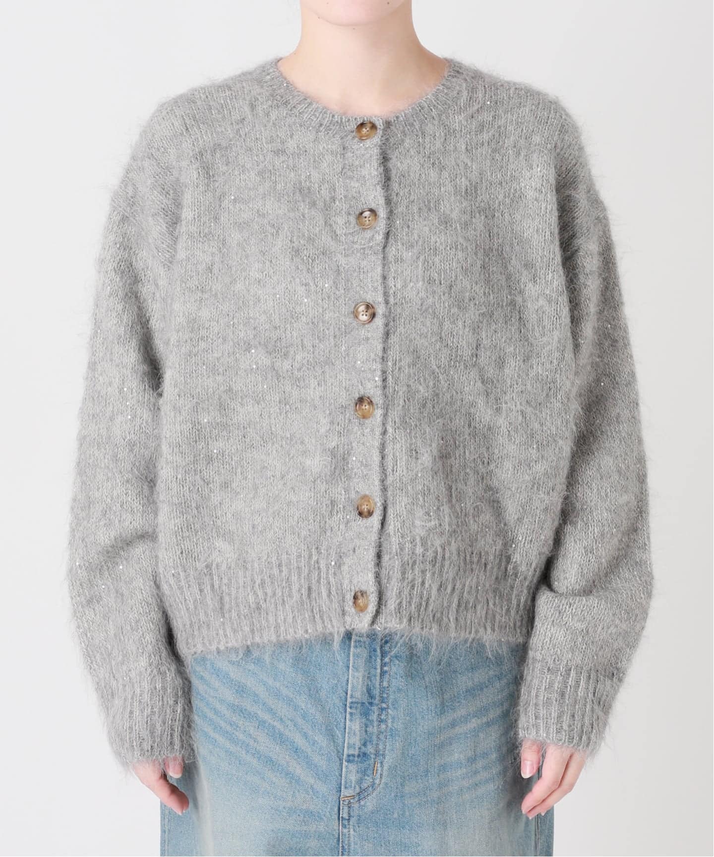アルパカ混の軽い素材でざっくり編み込んだ軽やかさが特徴のニットカーディガンは今年もトレンド継続中のスパンコールが華やかな印象に。