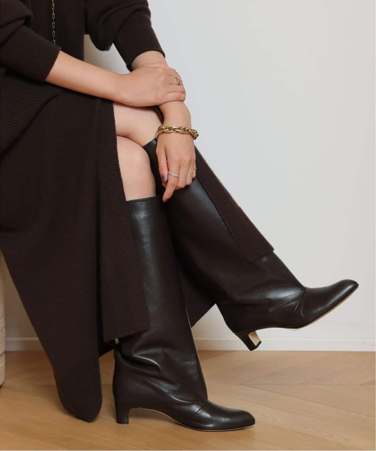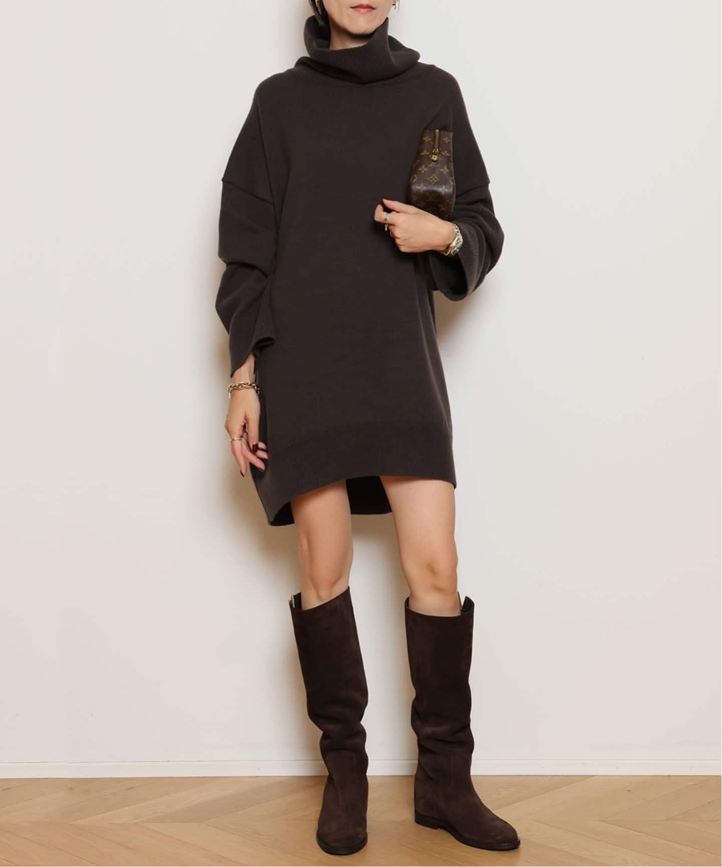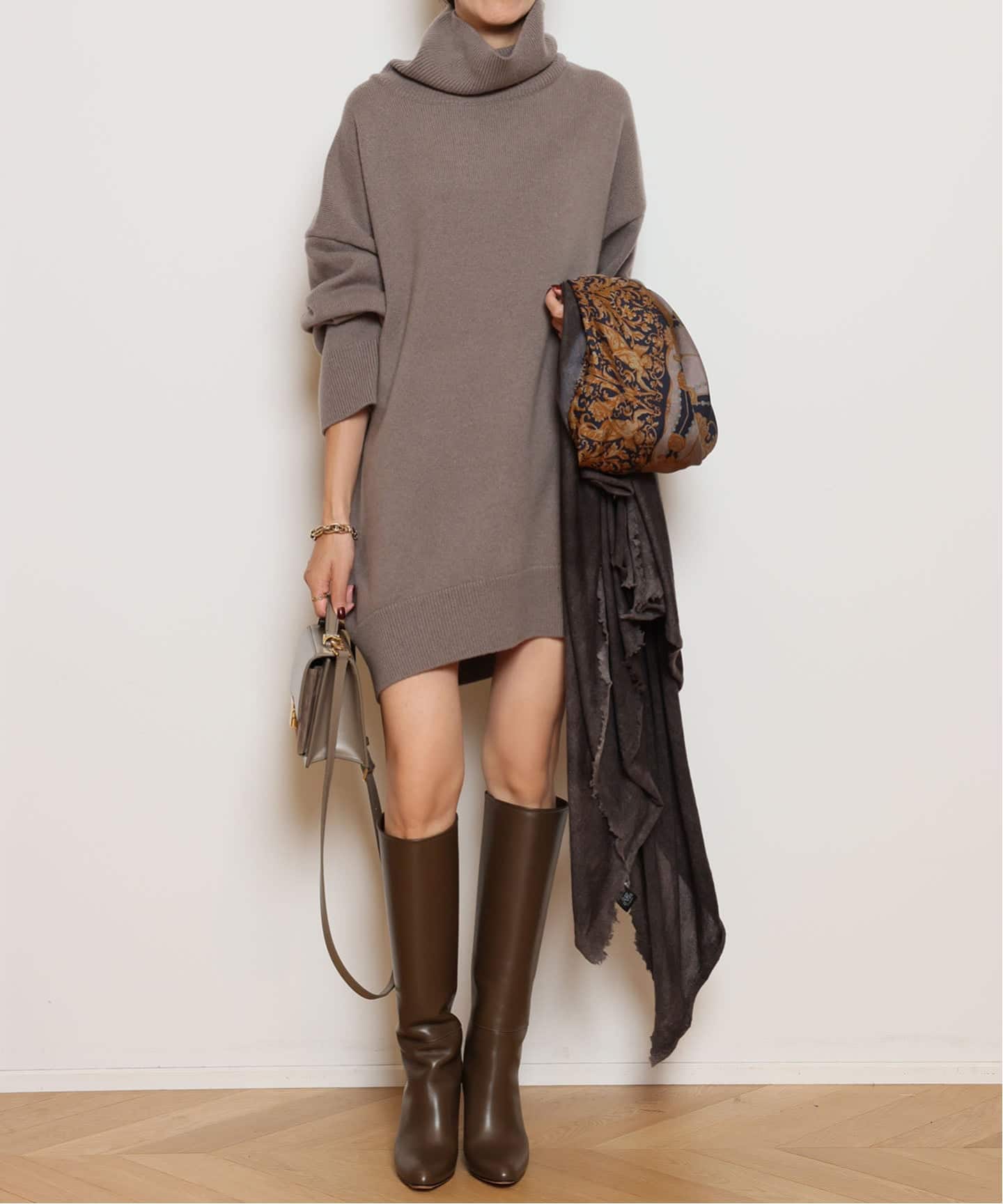 ブーツとのバランスが絶妙で、秋冬のスタイリングが楽しみになる一枚。