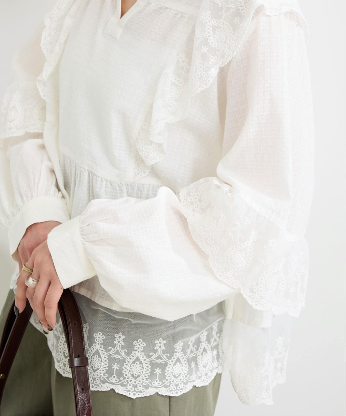 繊細な刺繍×シアーチュールレースのフリルデザインが一枚で着映えするブラウスです。