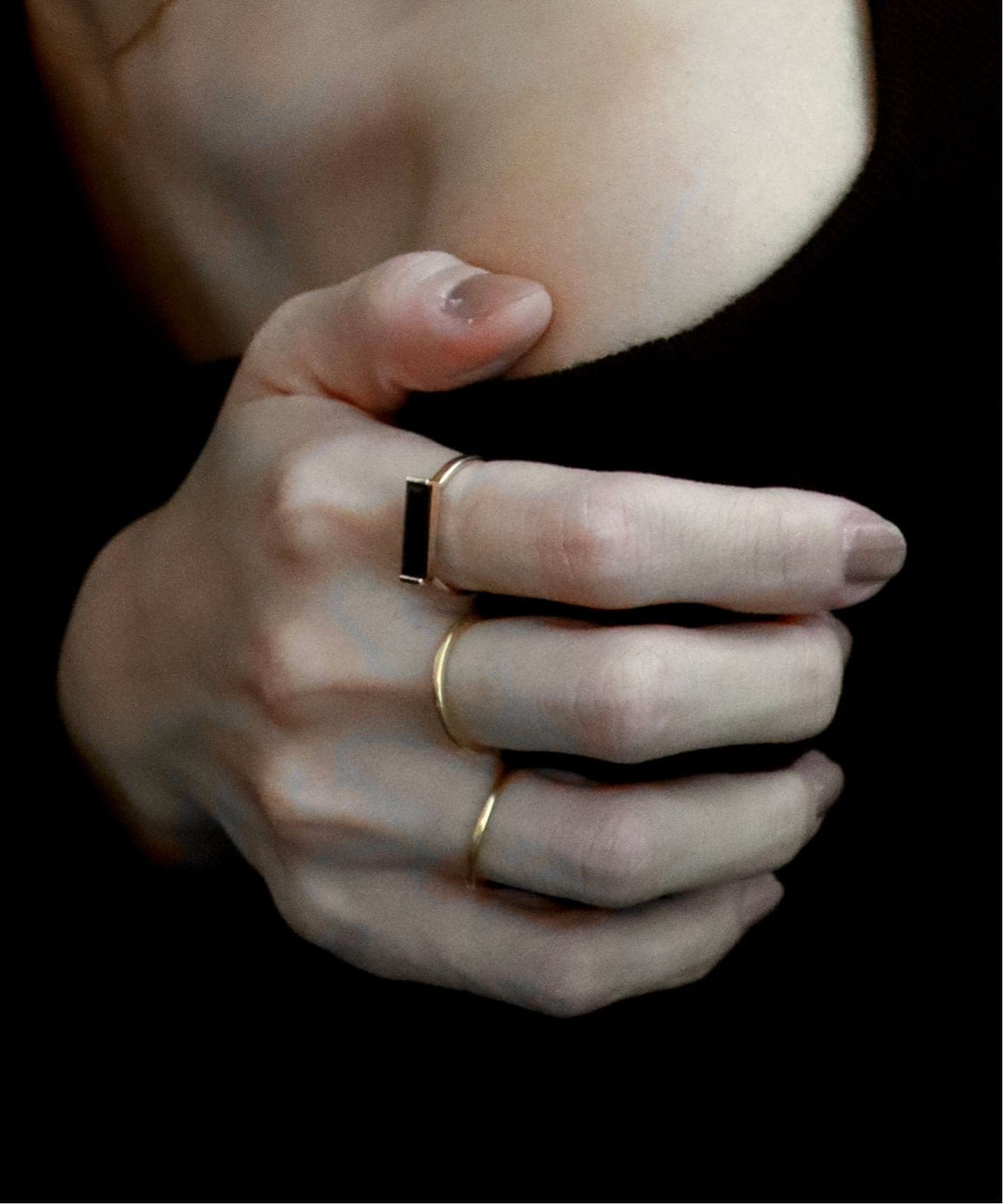 センターに長方形のオニキスを配し、両サイドから洗練された爪で留めたリング。黒とゴールドのコントラストが際立ち、シャープなラインが指先を引き締めます。単品で身につけても美しく、他のリングとのスタッキングに加えることで一層引き立ちます。コーディネートにモードなアクセントを添えるデザインです。