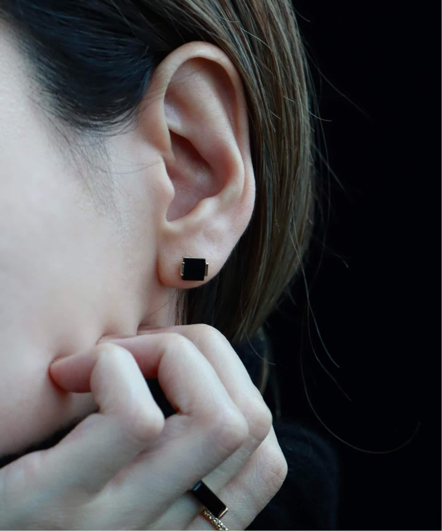 スクエアカットのオニキスを、余計な要節を削落としたシャープなオリジナルの爪でセットしたピアス。漆黒の石面を最大限に際立たせるミニマルなデザインは、光と影のコントテストを生み出し、顔まわりにオニキスのモダンで知的な印象を与えます。