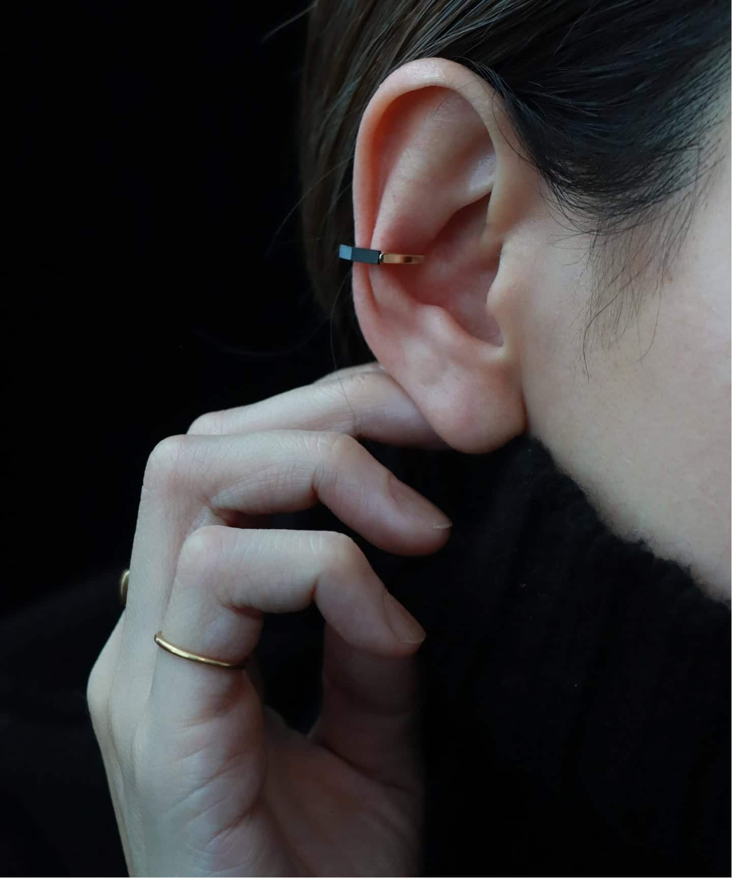オニキスを山のシルエットでセットしたイヤーカフ。立体的でシャープなフォルムが耳元を引き締め、黒と金のコントラストが洗練されたモード感を引き立てます。単品使いでも印象的に映えますが、他のピアスやイヤーカフとレイヤードすることでスタイリングが引き立ち、コーディネートにアクセントをプラス。