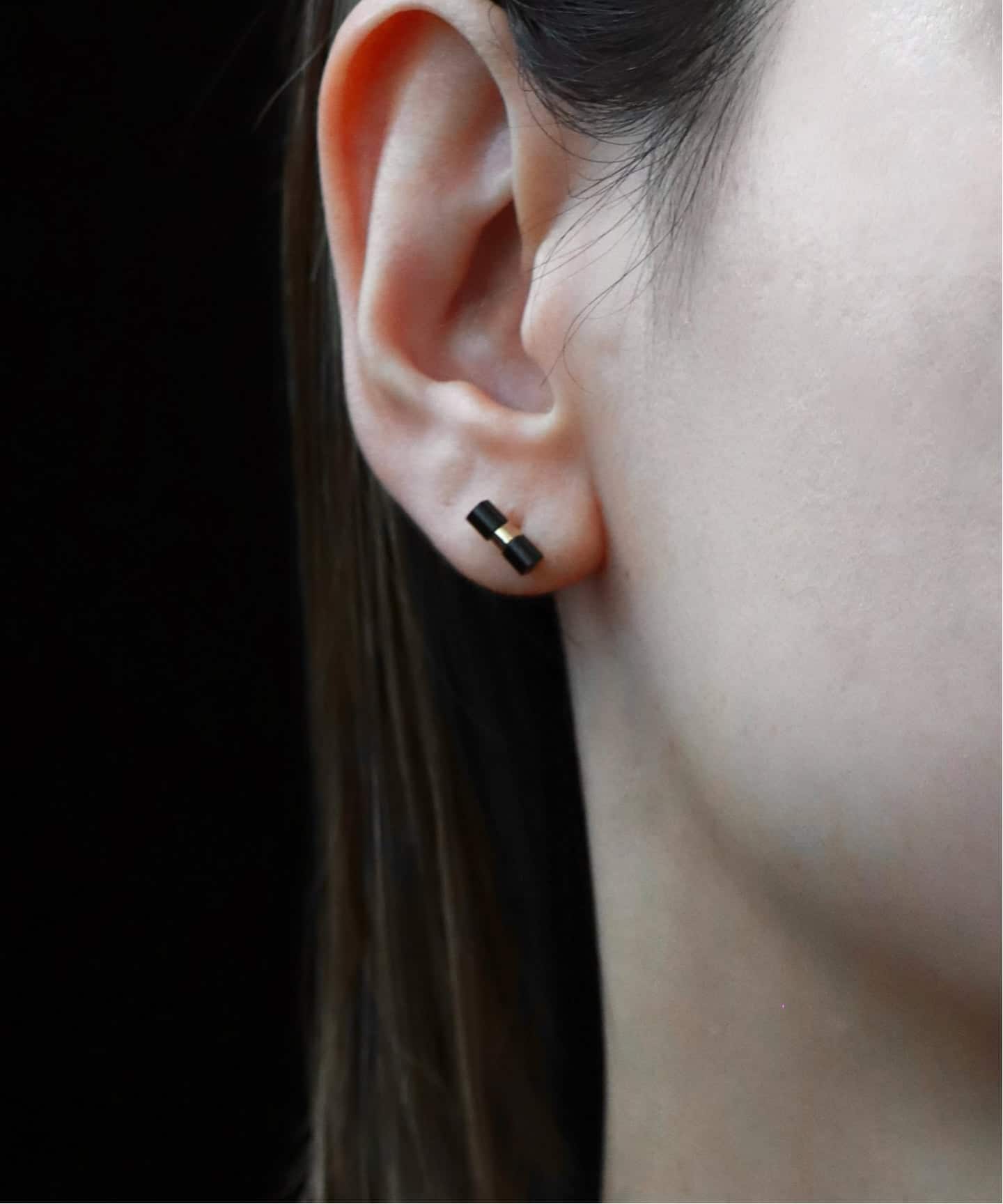 漆黒のオニキスをゴールドでセンターホールドしたピアス。中央で留める構築的なデザインが、黒と金のコントラストをクリアに浮かび上がらせます。