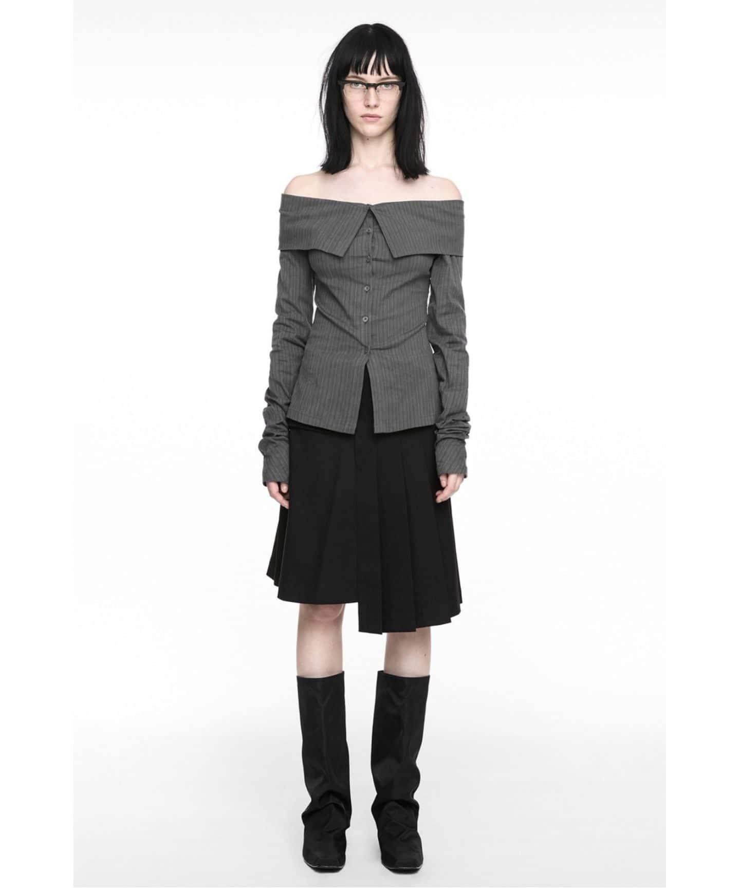 左上のシャツ風オフショルは、タイトなシルエットなので華奢見え間違いなしのトップスです。