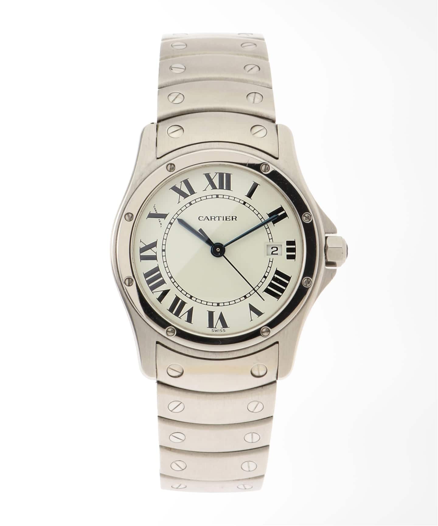 サントスクーガーは1987年に誕生したサントスガルベの派生型。当時のカルティエを代表するブレスレットモデルのひとつ。通常のスクエアではなくラウンドでデザインされた ケースと、アーチを描くブレスレットが特徴。MMサイズのこちらは約30mmのユニセックス仕様。