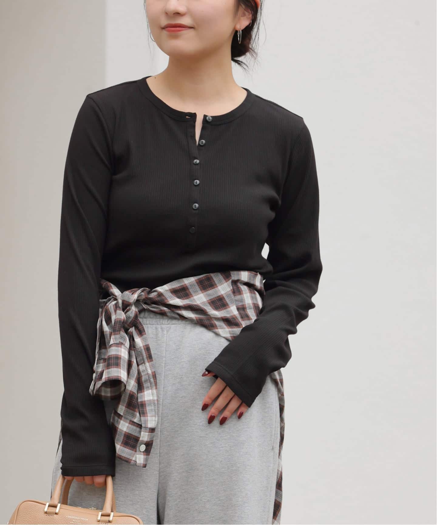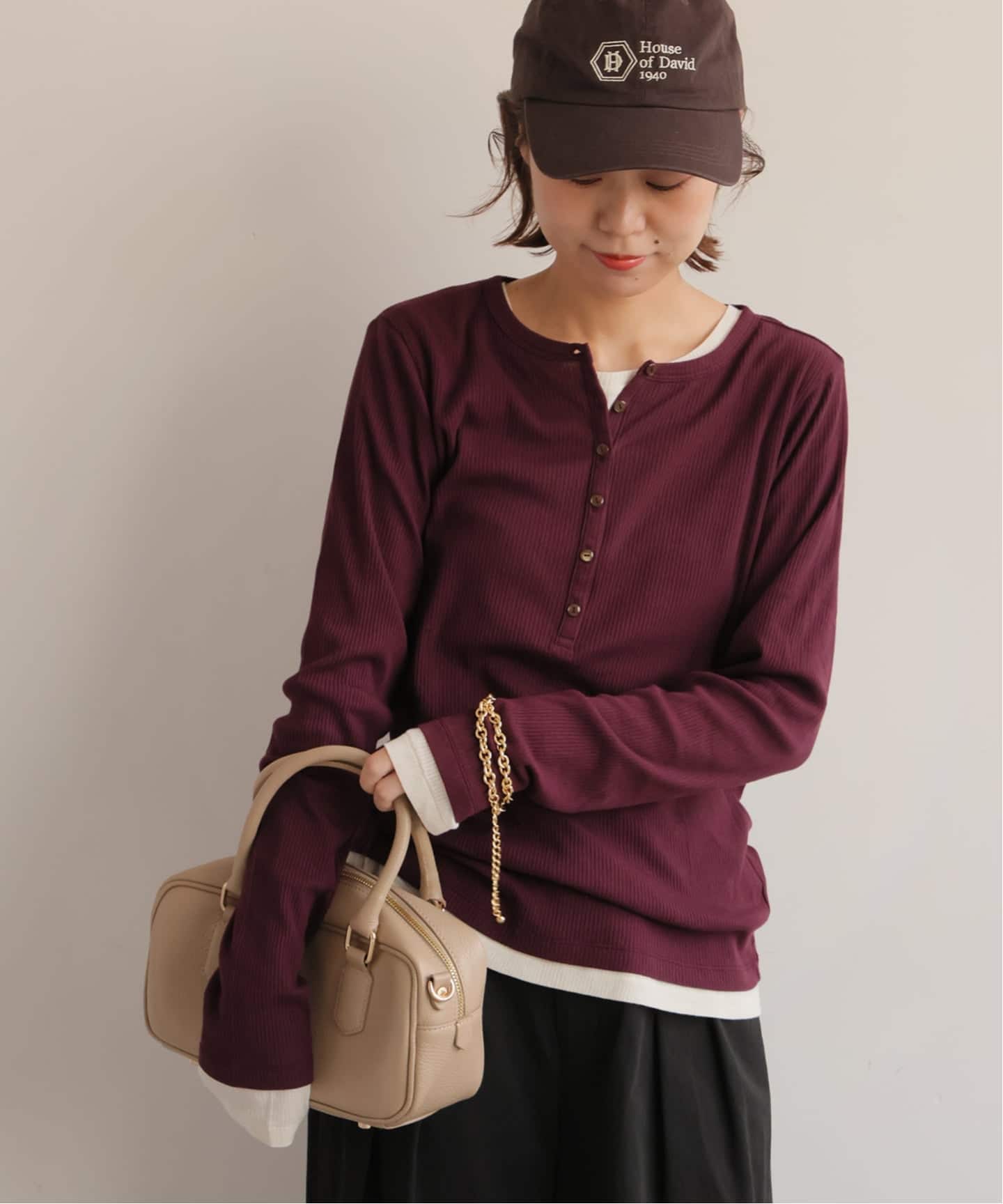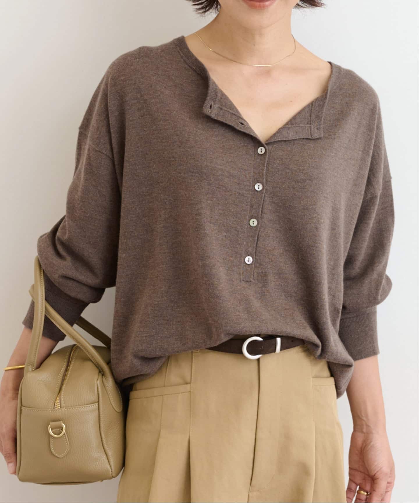 生地から別注して、肌触り良く透けすぎないシーズンレスで着回しできるようにこだわったコンパクトヘンリーネックプルオーバー。
