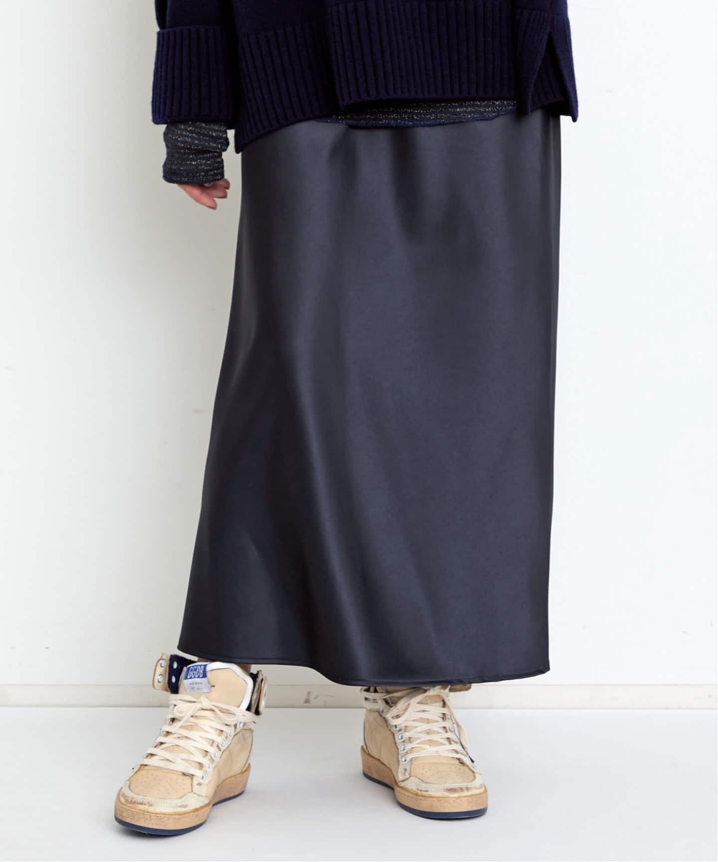 上品な艶とハリ感のサテンスカート。しっかりとした素材感がラインをキープし、モードな雰囲気をプラス。