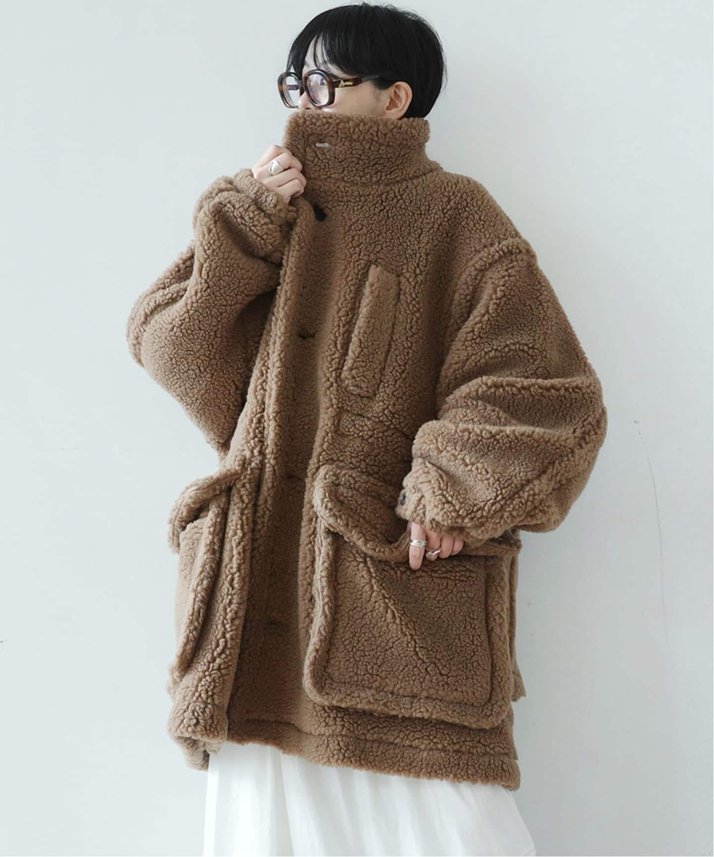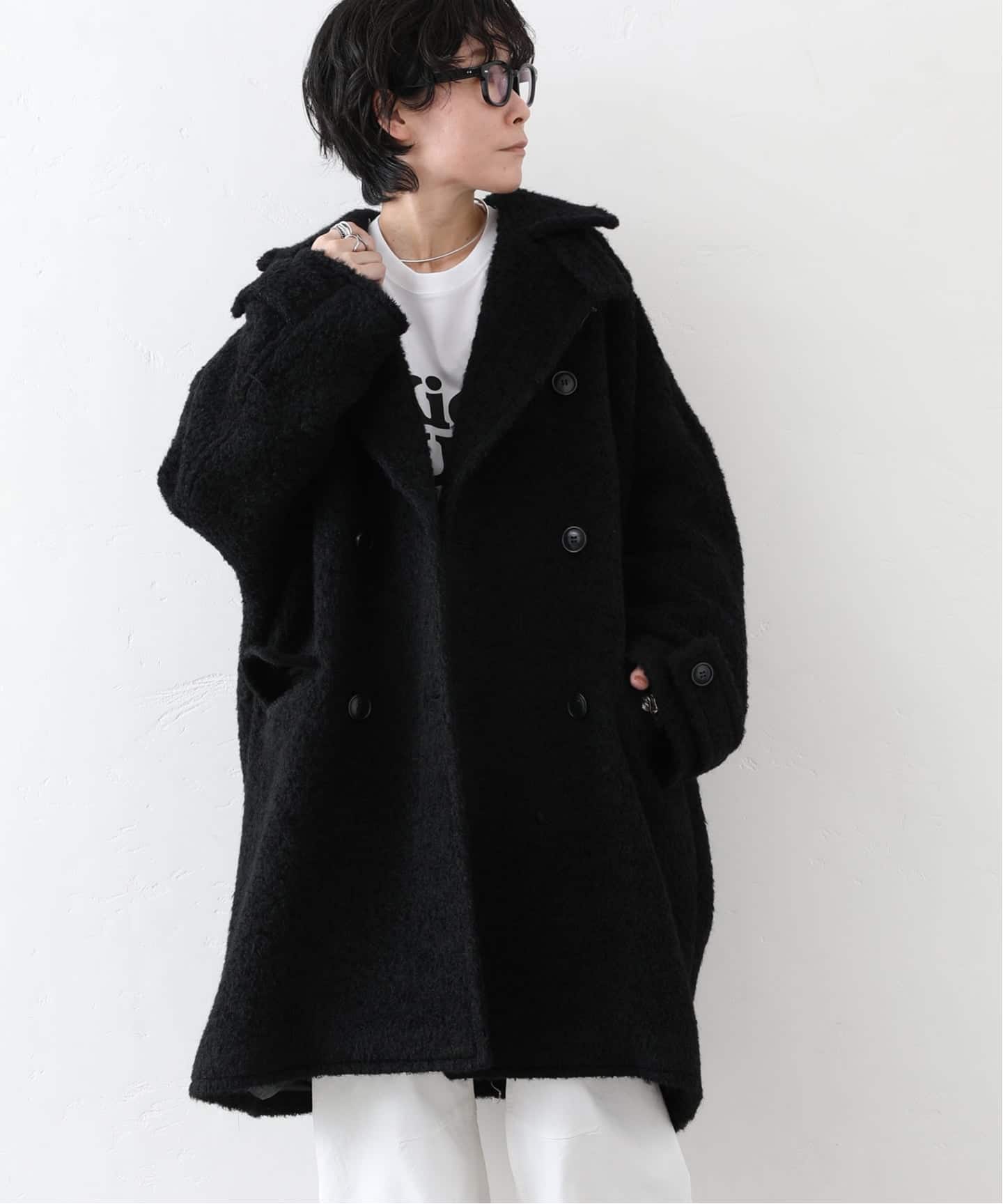 クルクルとカールした表情と柔らかな手触り、シルクのような光沢感のある、モヘヤ・ウール・ナイロン混紡の素材を使用した、メンズライクなオーバーサイズのPコート。襟を立ててもラフに羽織っても様になる、ボリューム感のある一着です。