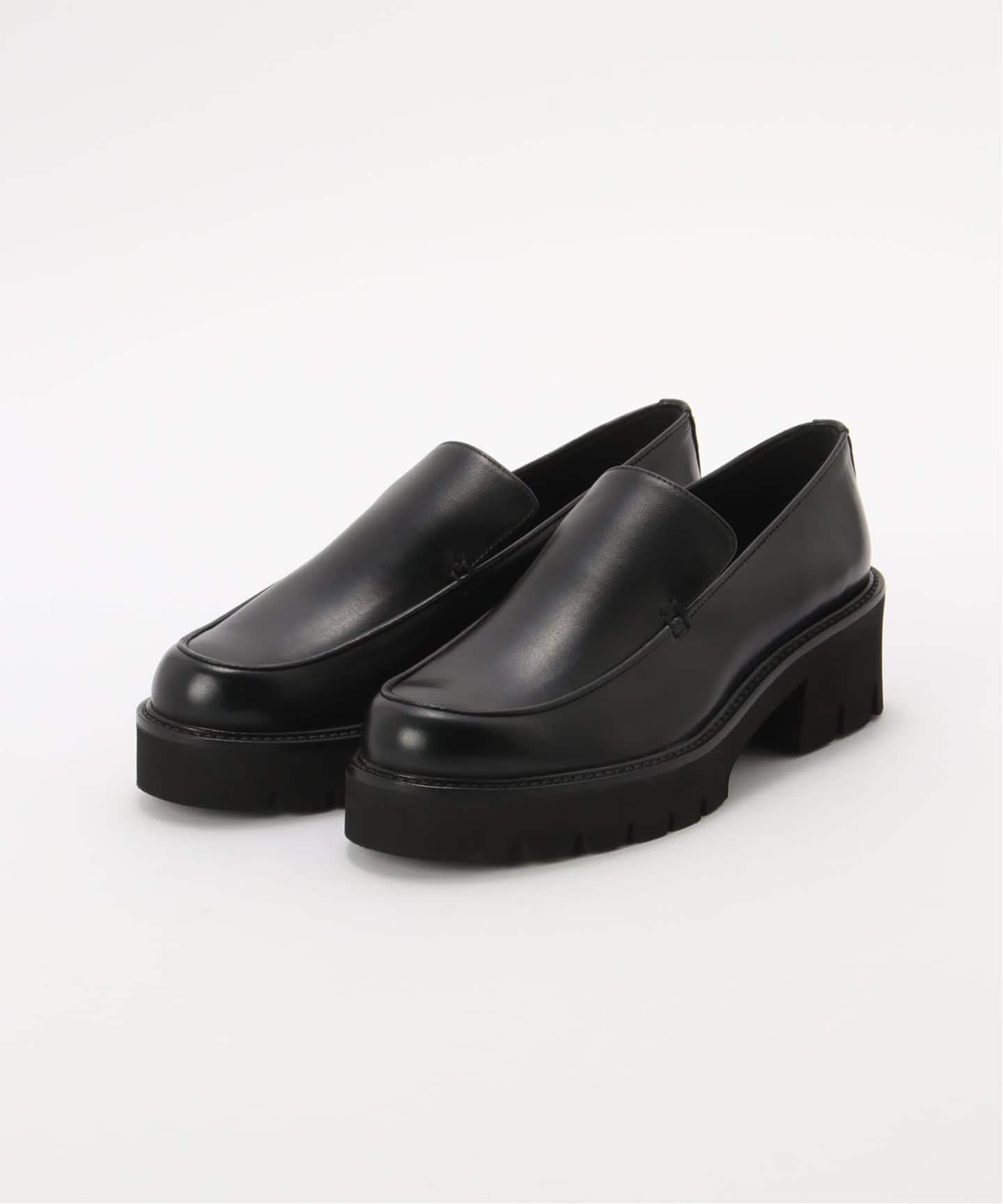 サークル状のエッジを効かせたトウ先とメタルのロゴモチーフで、シンプルながらもモードな足元を演出してくれるヒールローファー。