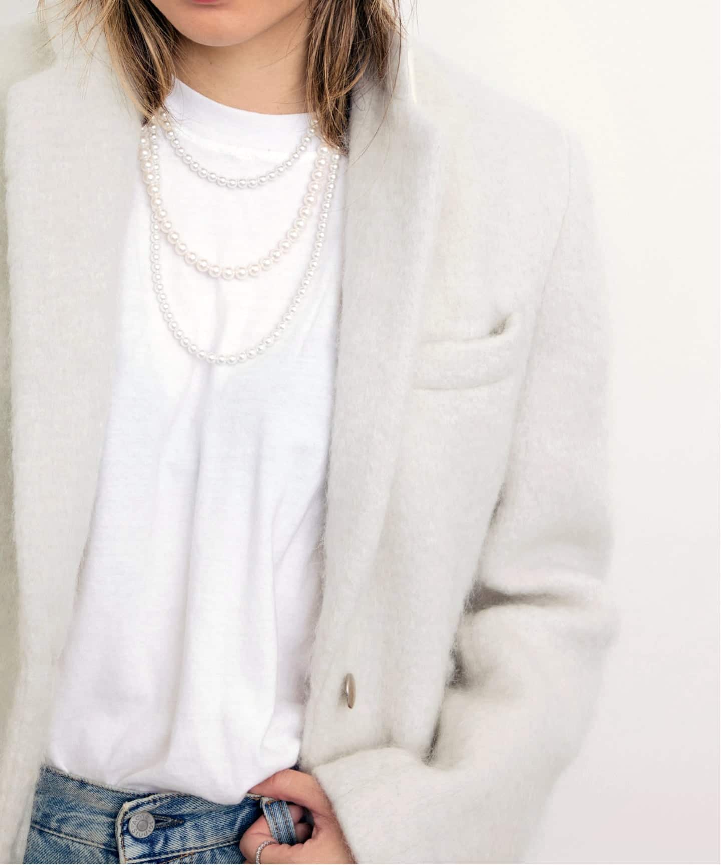 首元のリブを、くしゅっとラフに整えてシルエットを変えることもできます。一枚で思いっきり女っぽく着たり、シャツと重ねてアレンジしたり。