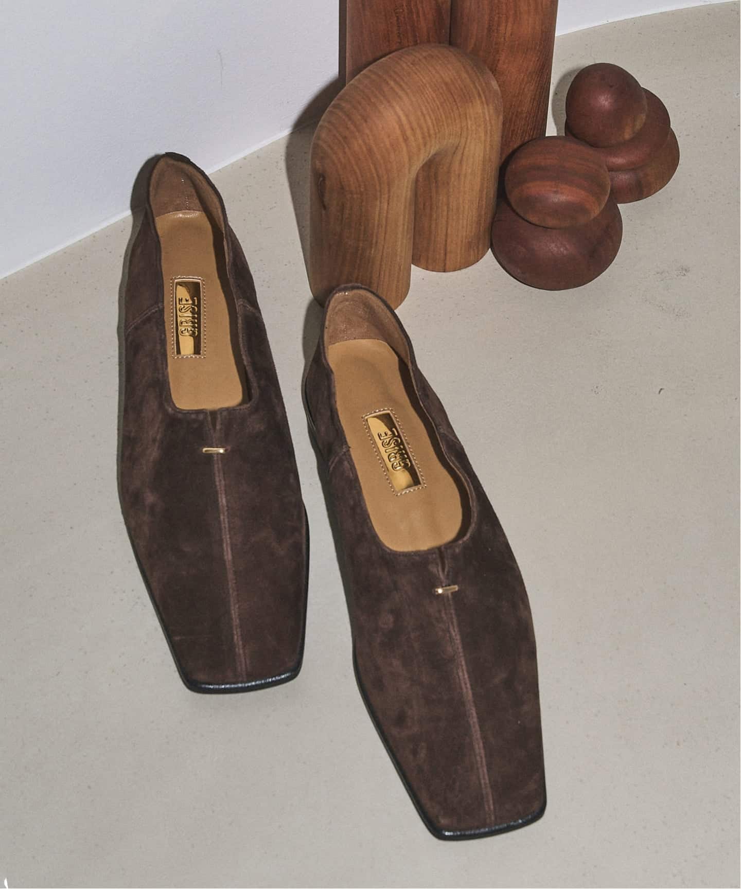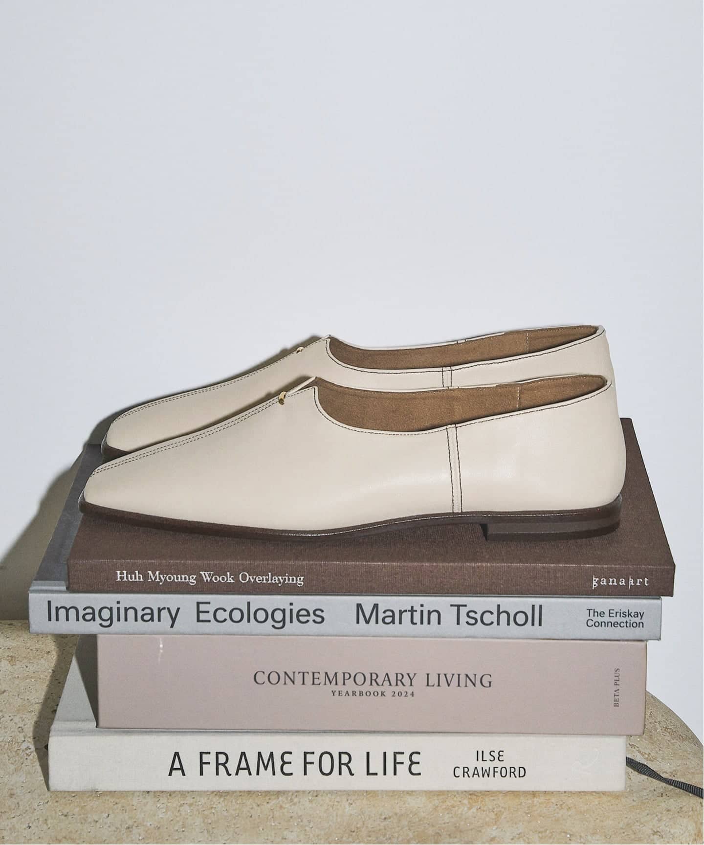 スクエアトウのすっきりとしたノーズデザインが美しいレザーフラット。