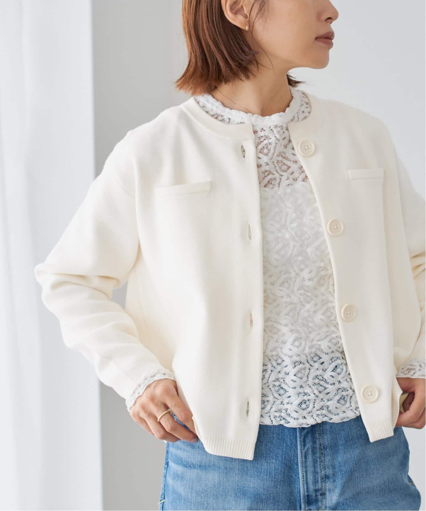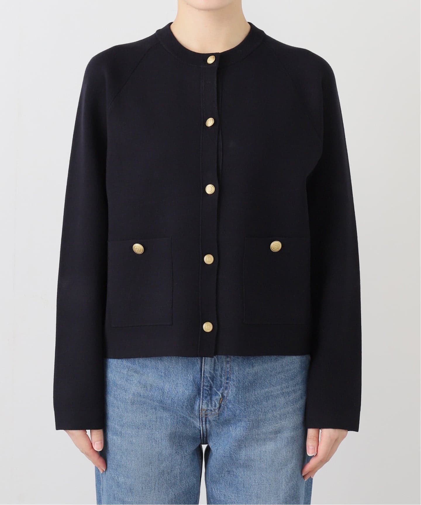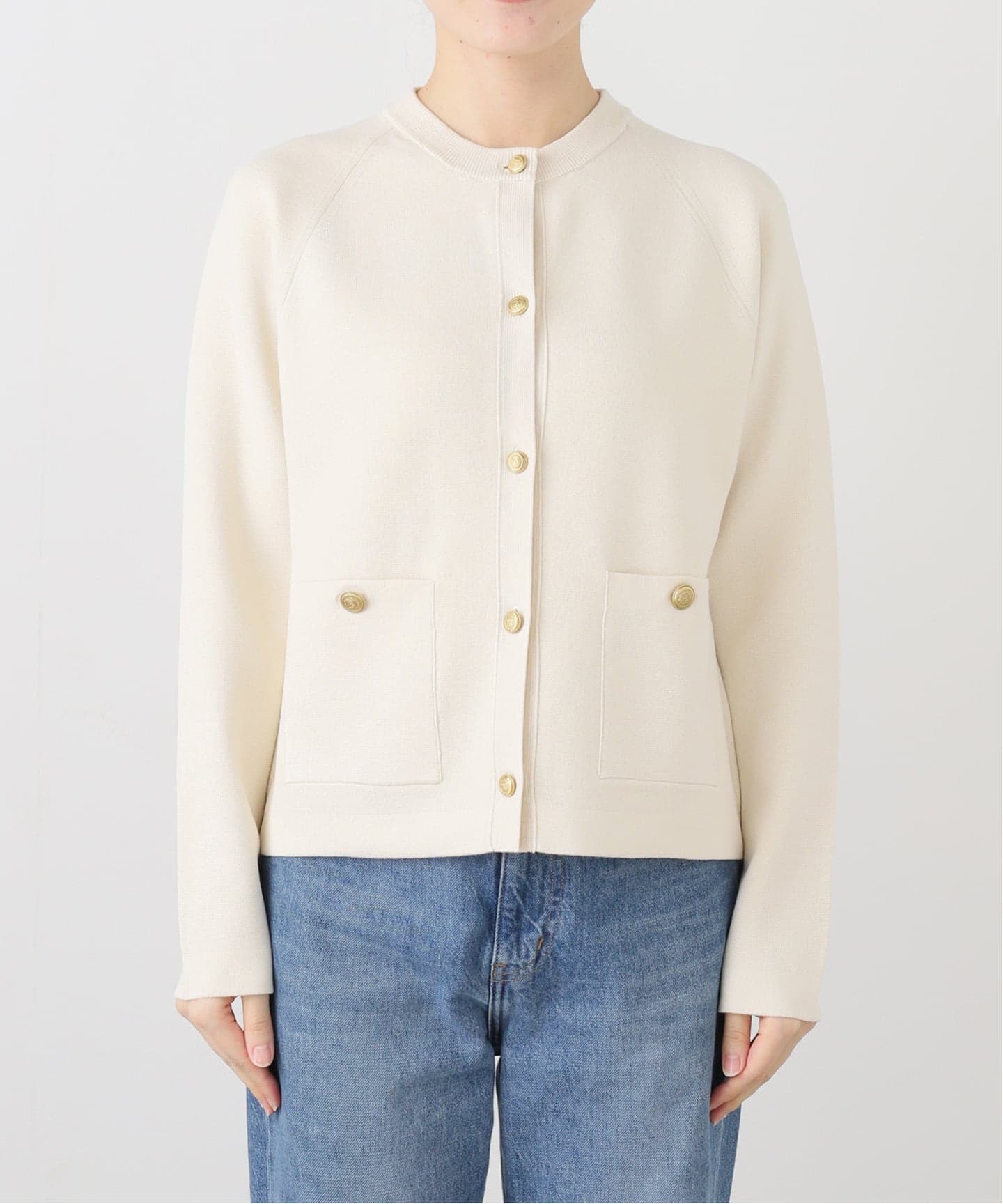 縦にズラッと並んだスナップボタンがポイントのカーディガン。