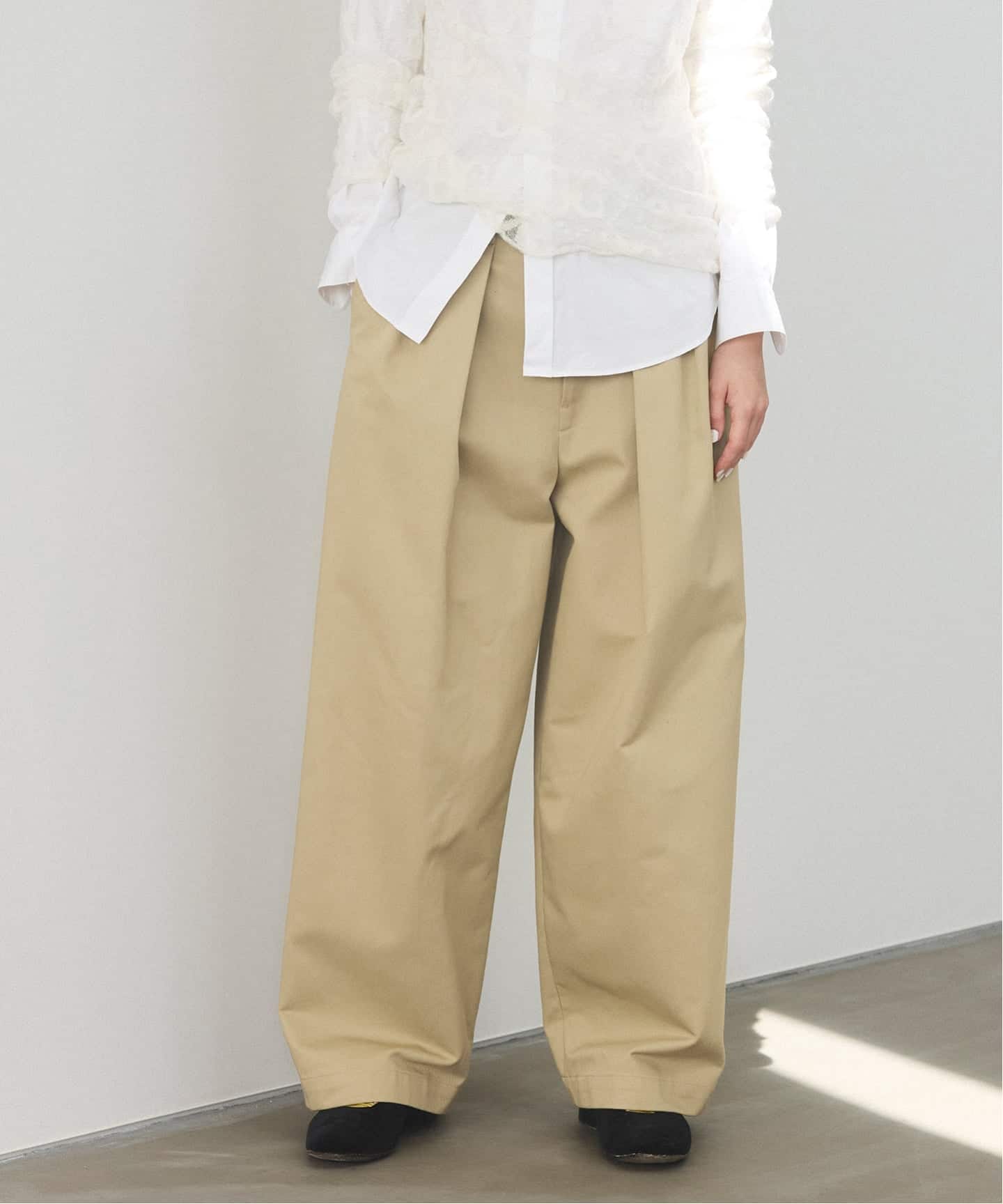 メンズ仕立てのオーバージャケットに、ワークムード漂うチノパンを合わせたトラッドカジュアル。