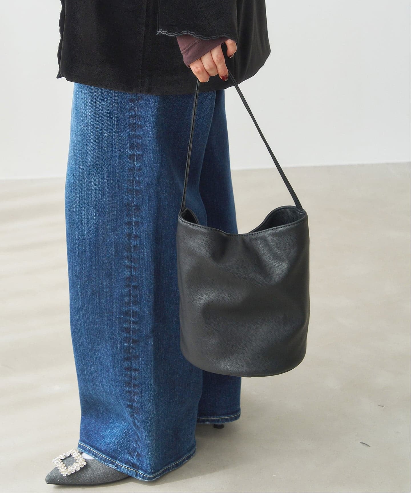 モノトーンコーデに差し色になるブルーがポイント。オフィススタイルにもおすすめの品良く履けるパンプスです。立体感のある甲のモチーフが足元を華やかに♩