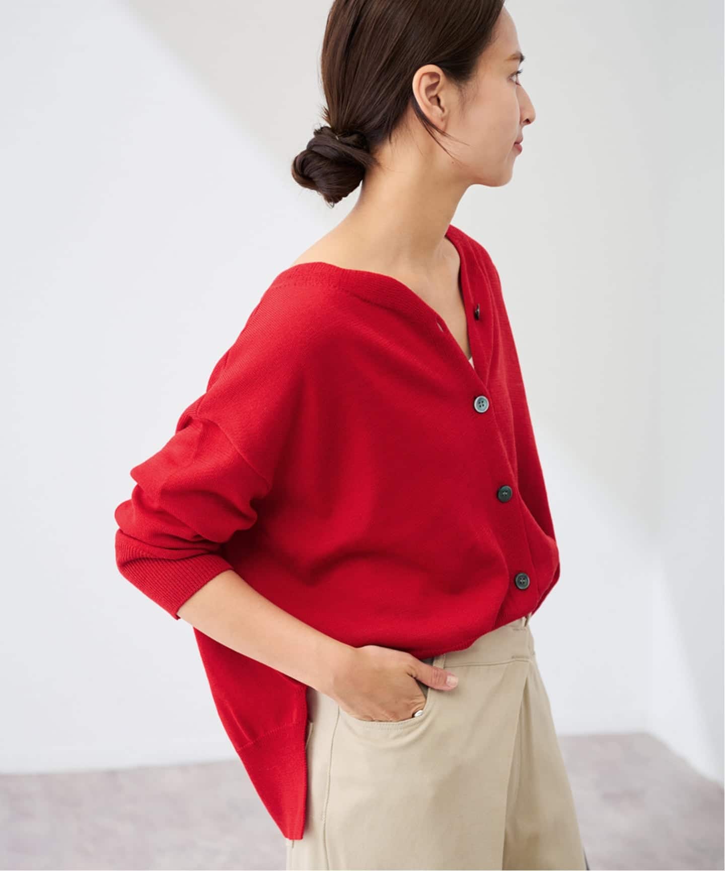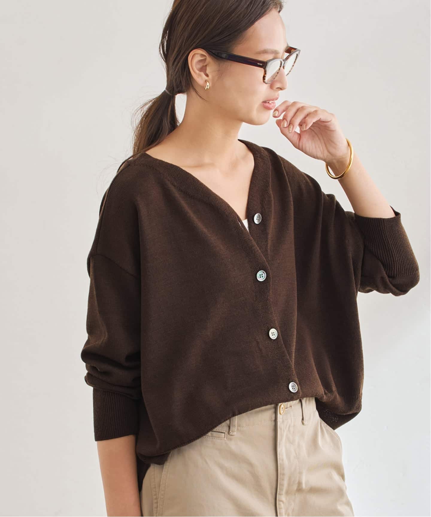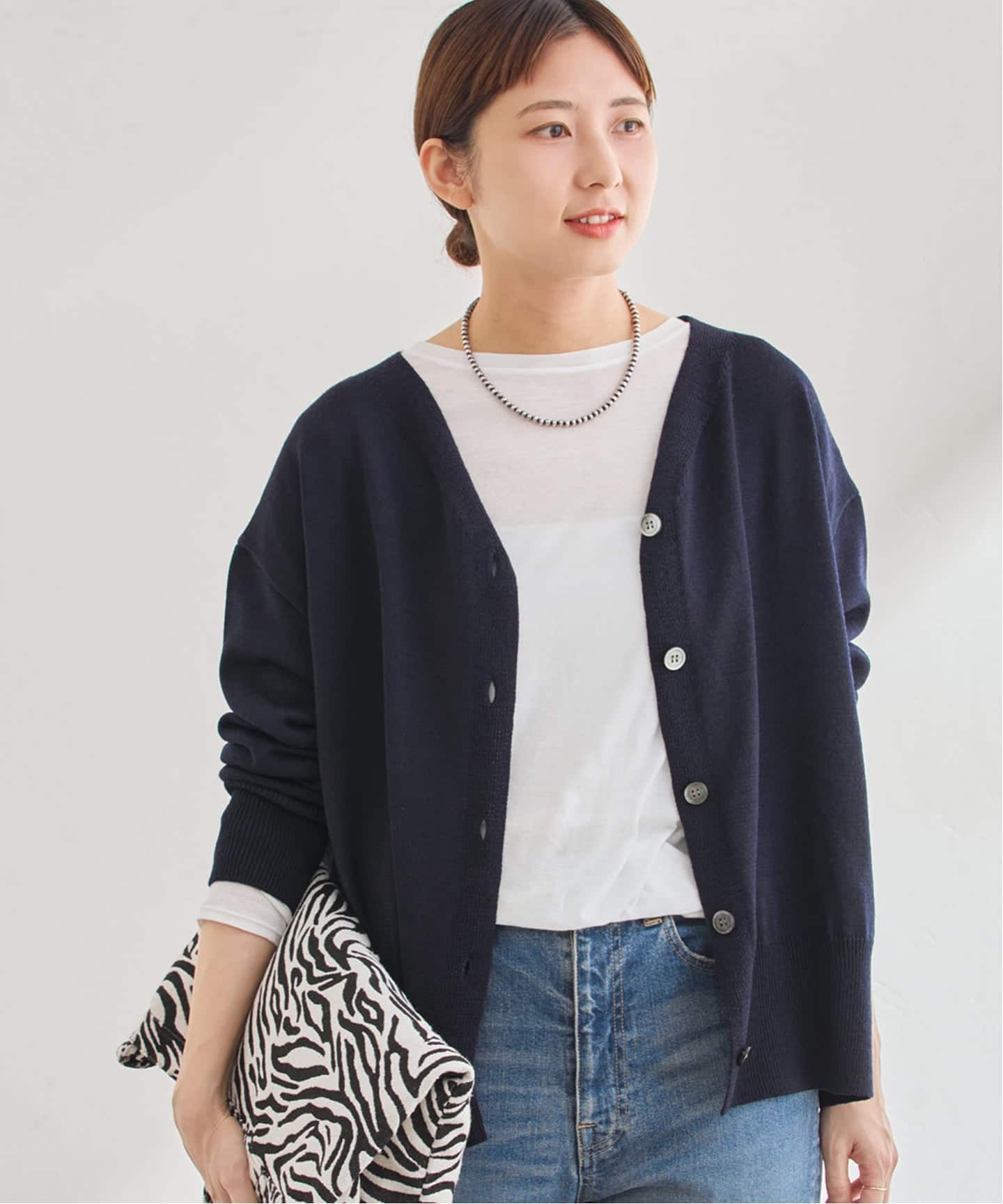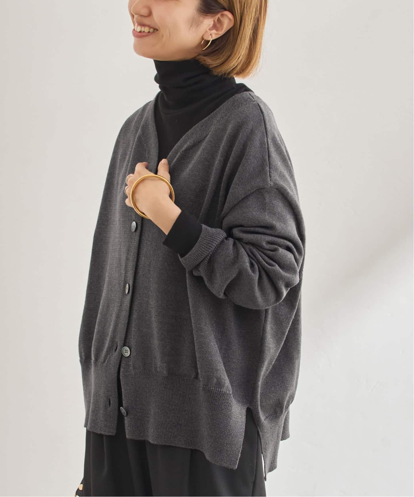 やや短め丈で、ワイドパンツとのバランスが取りやすいカーディガン。