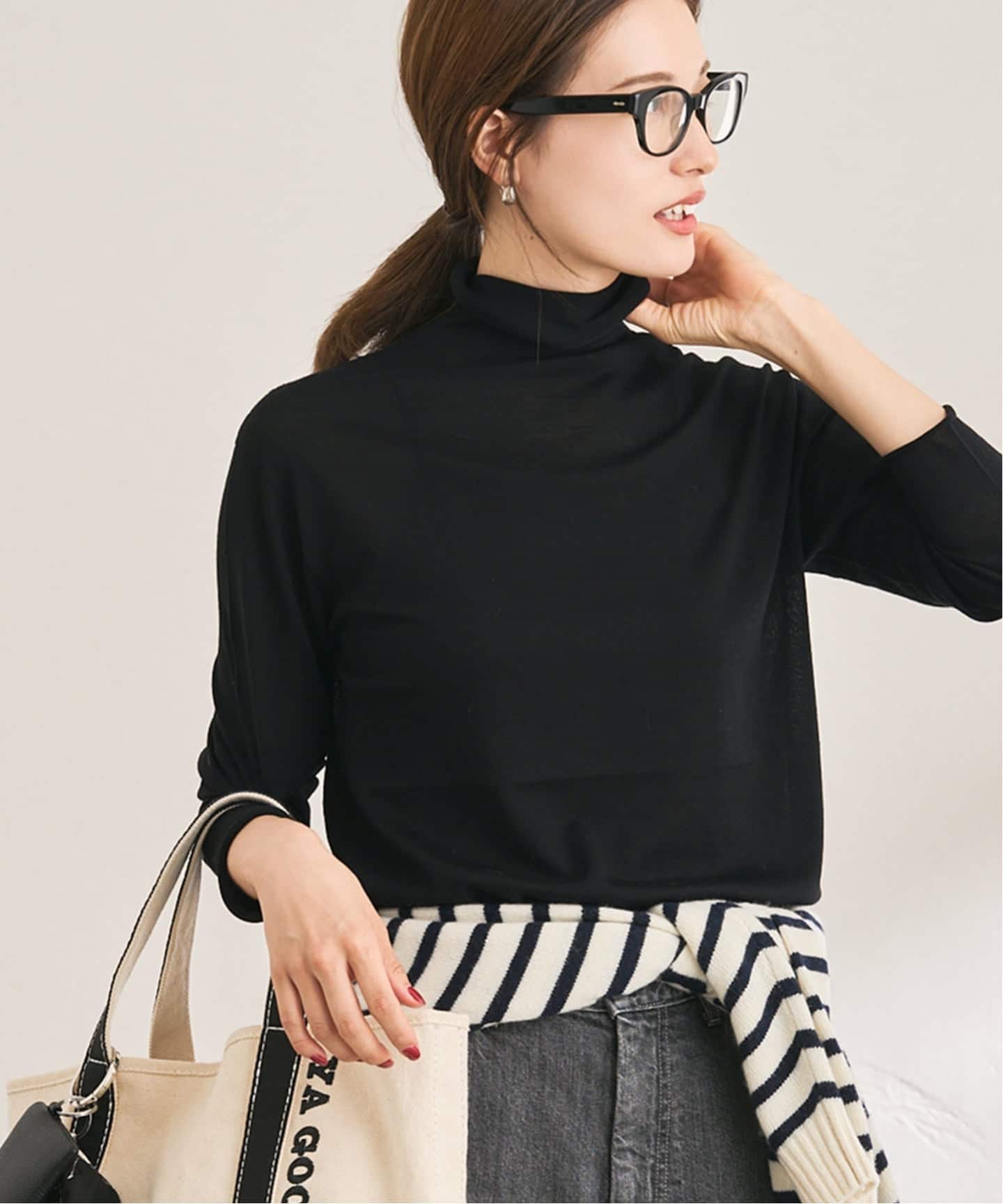 きゅっと詰まった首元が、ミニマルな印象も感じさせます。