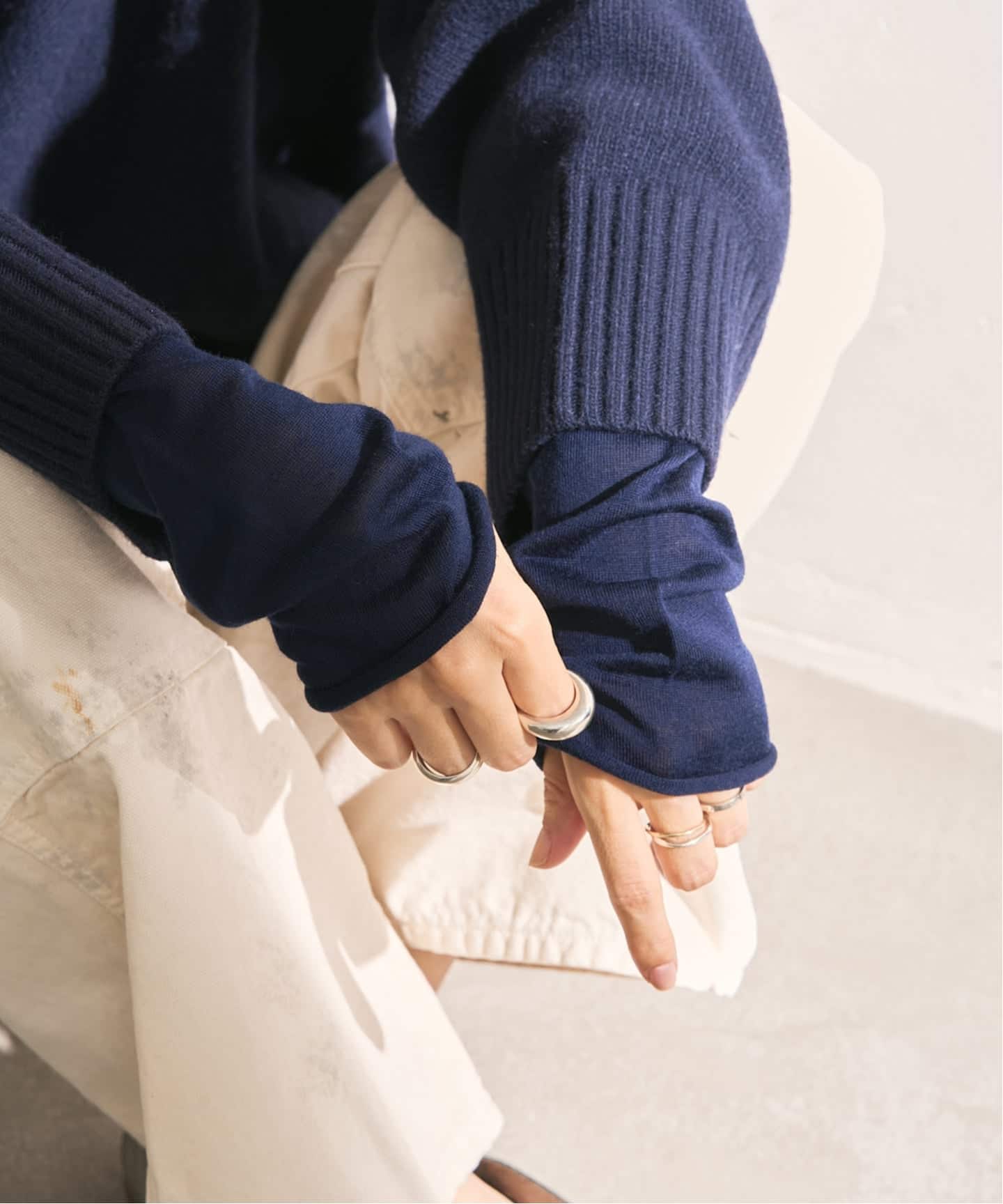 短めの着丈に対し、ゆるっと溜まる袖丈にすることで女性らしいシルエットに。