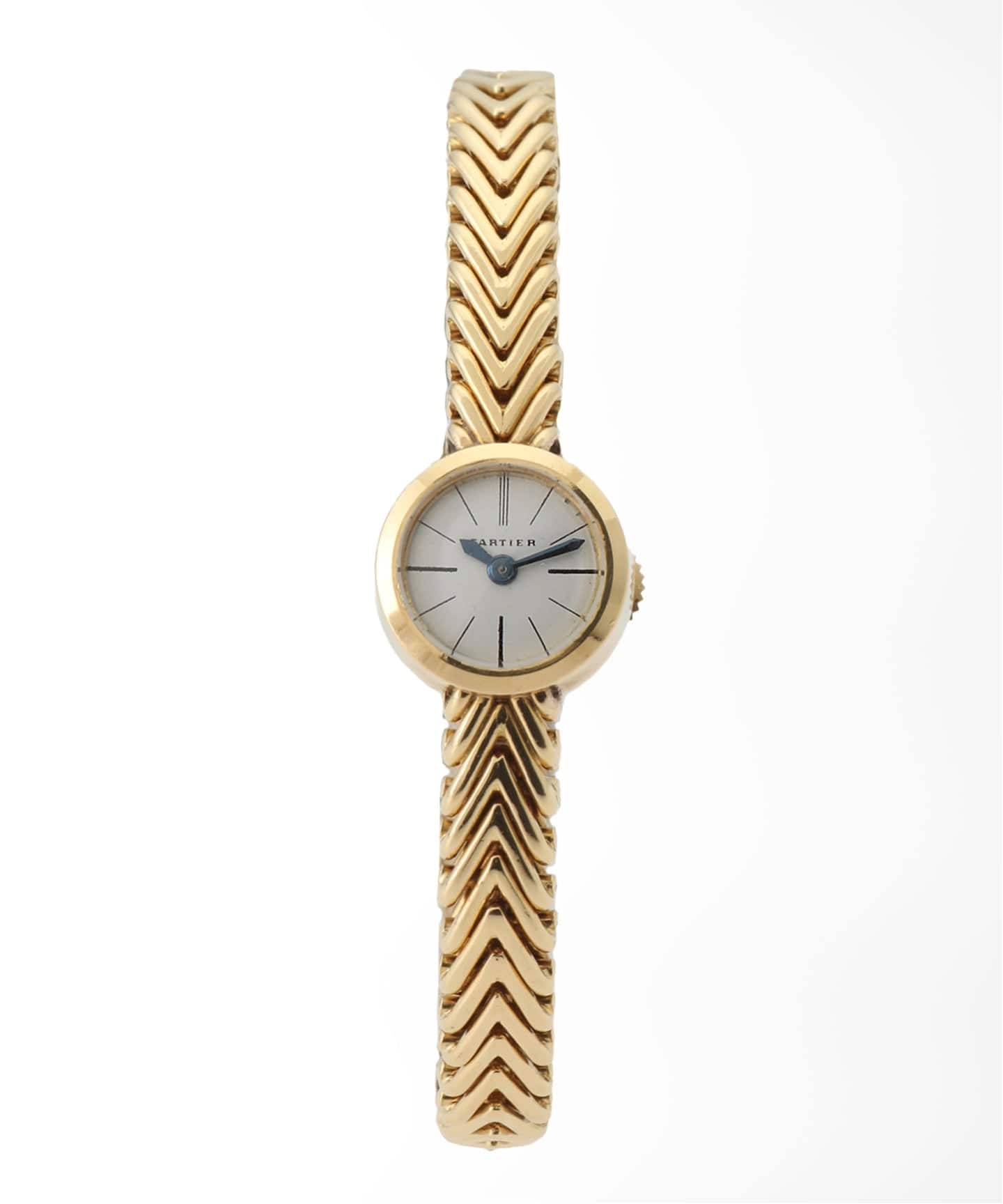 40年代頃のカルティエウォッチ。ヘリンボーン装飾のブレスレットはしなやかに動き、腕に優しく馴染みます。リューズが裏側にあるバックワインドのディテールは、ジュエリーのように対称なシルエットを実現。