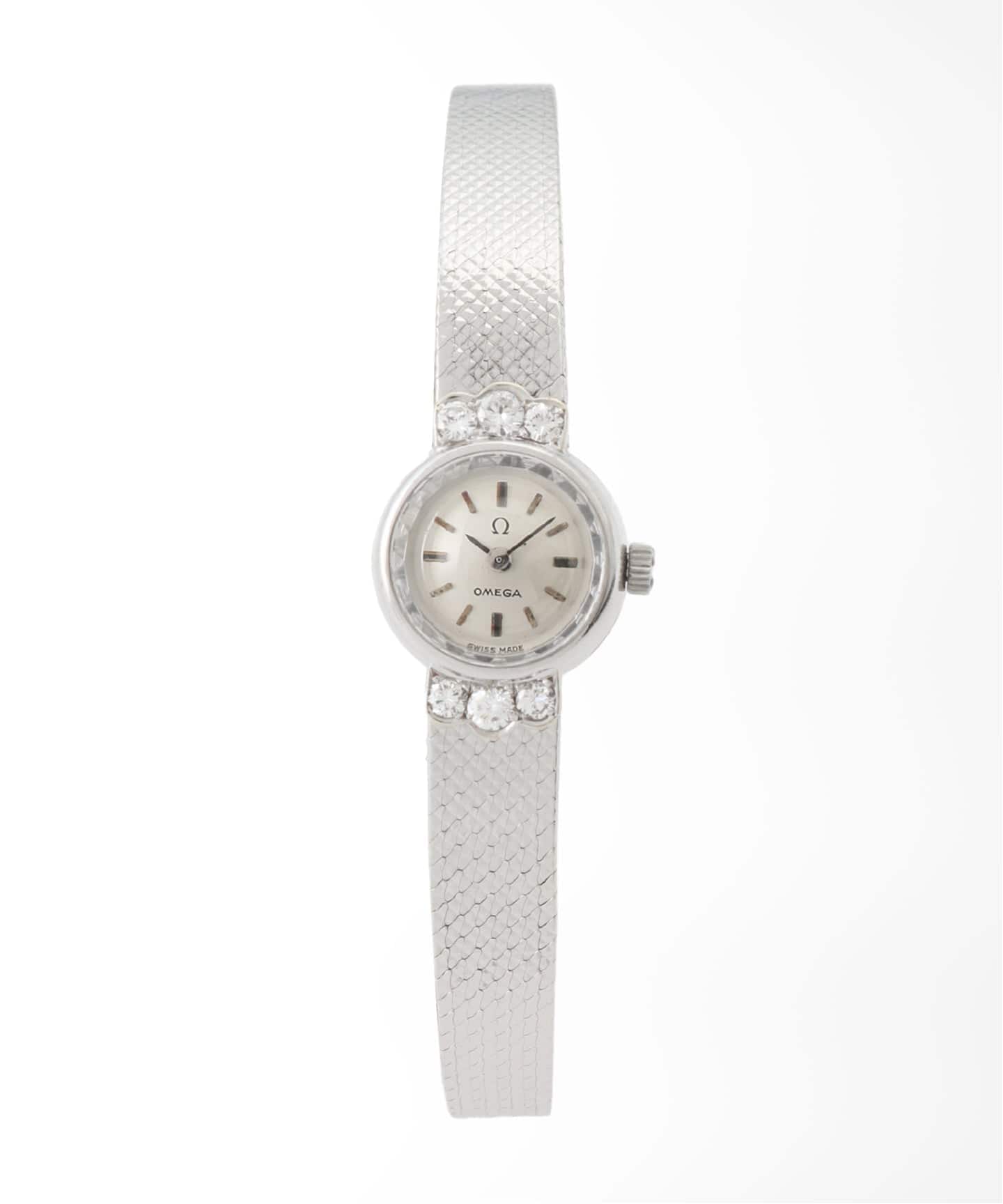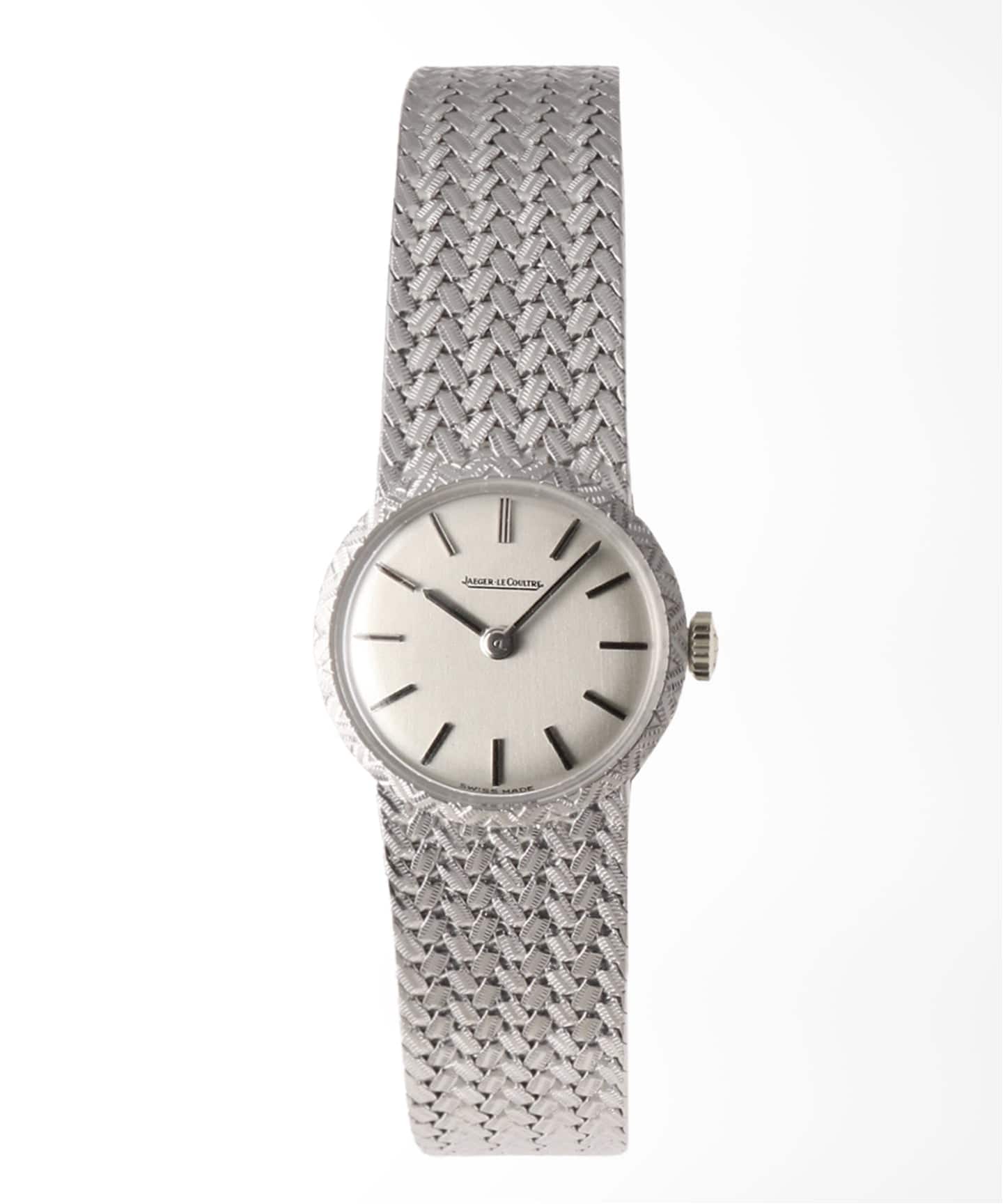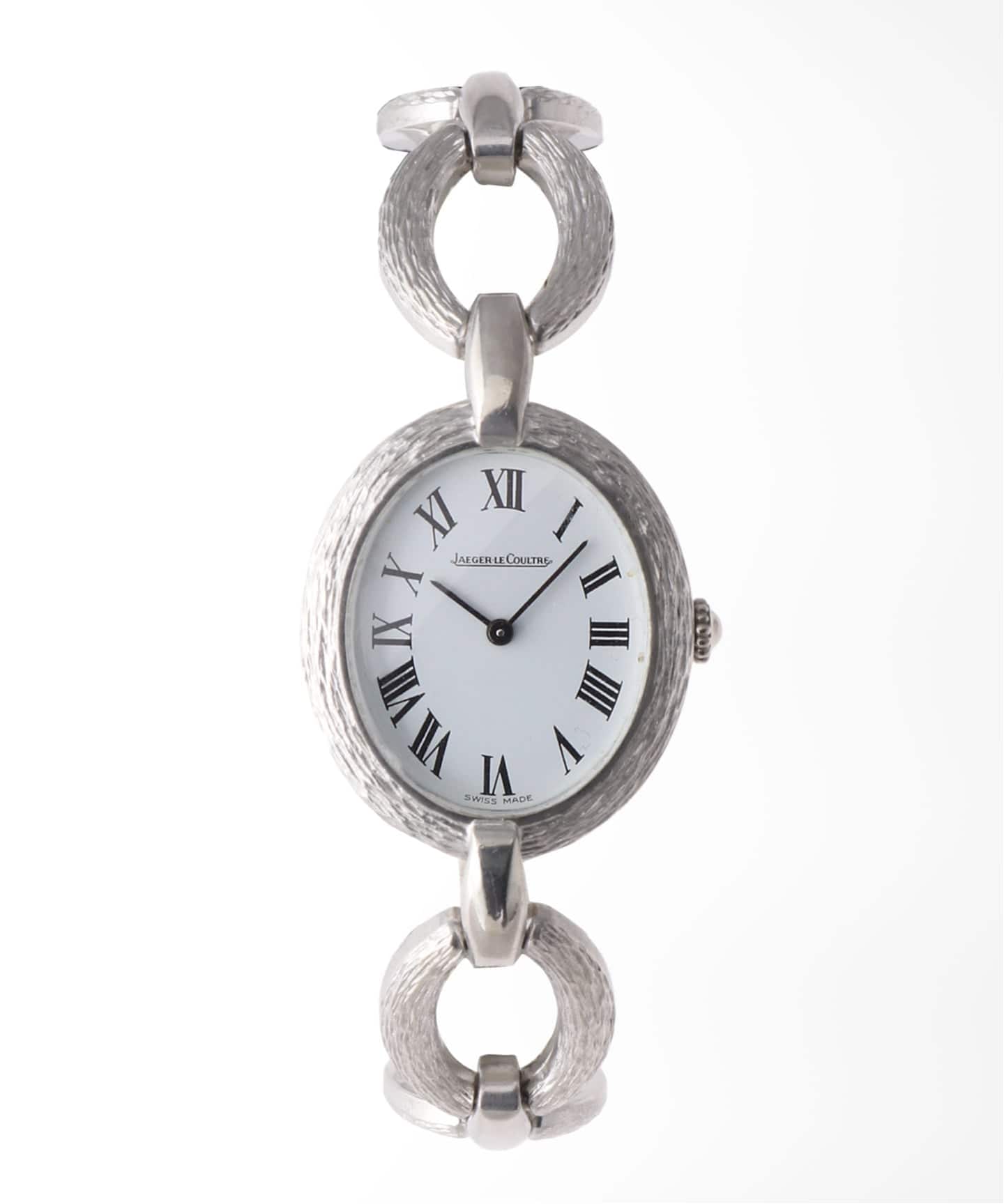 同じくジャガールクルトから。幾何学状に編み込まれたブレスレットが芸術的なニュアンスを放つレディースヴィンテージ。ケースにも同様の装飾が施され、細部までこだわりが感じられる一本です。