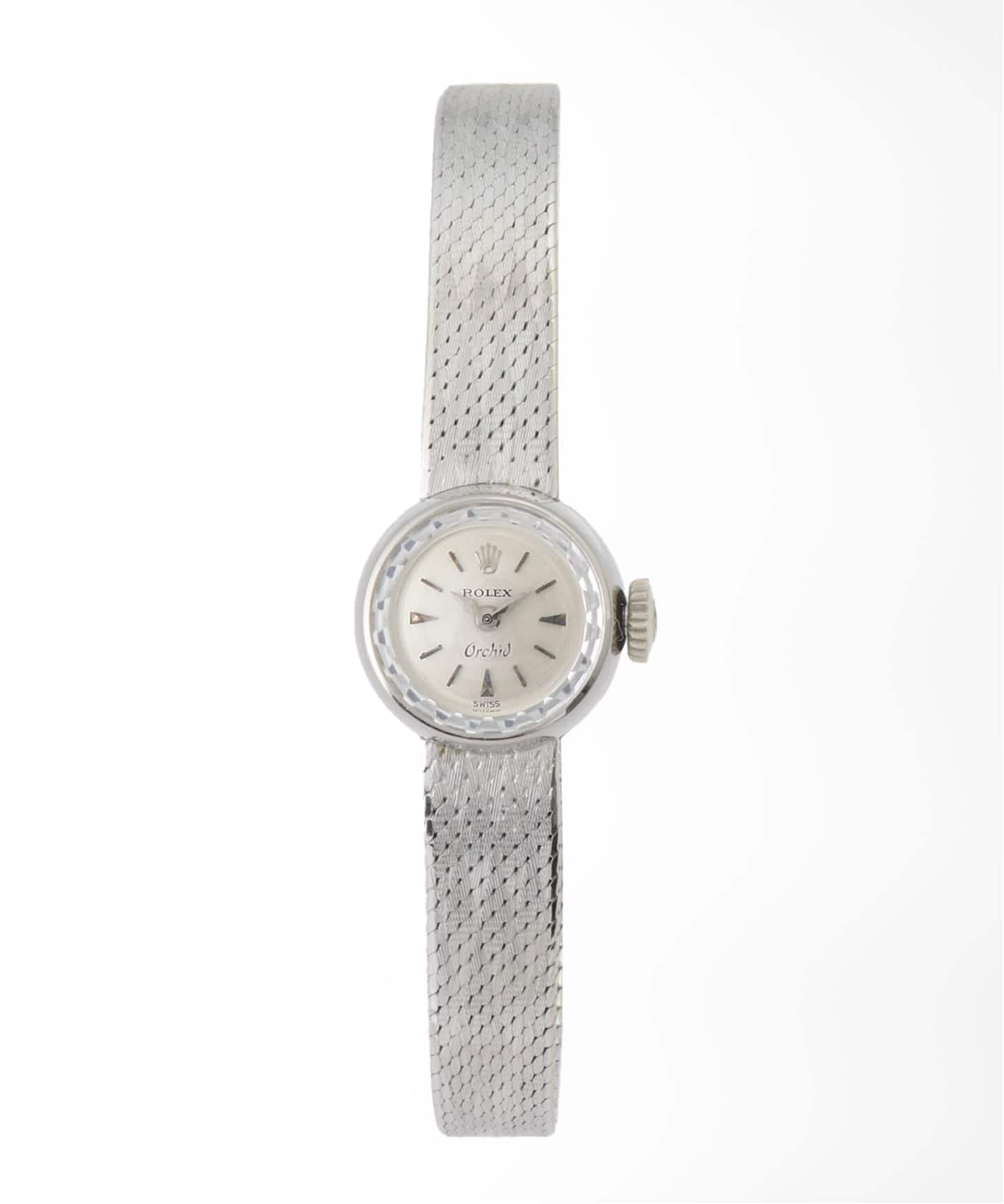 60年代に流行したカットガラス風防と、斜め格子のパターンで装飾されたブレスレット。オーキッドは蘭の花を意味する女性のためのコレクションです。